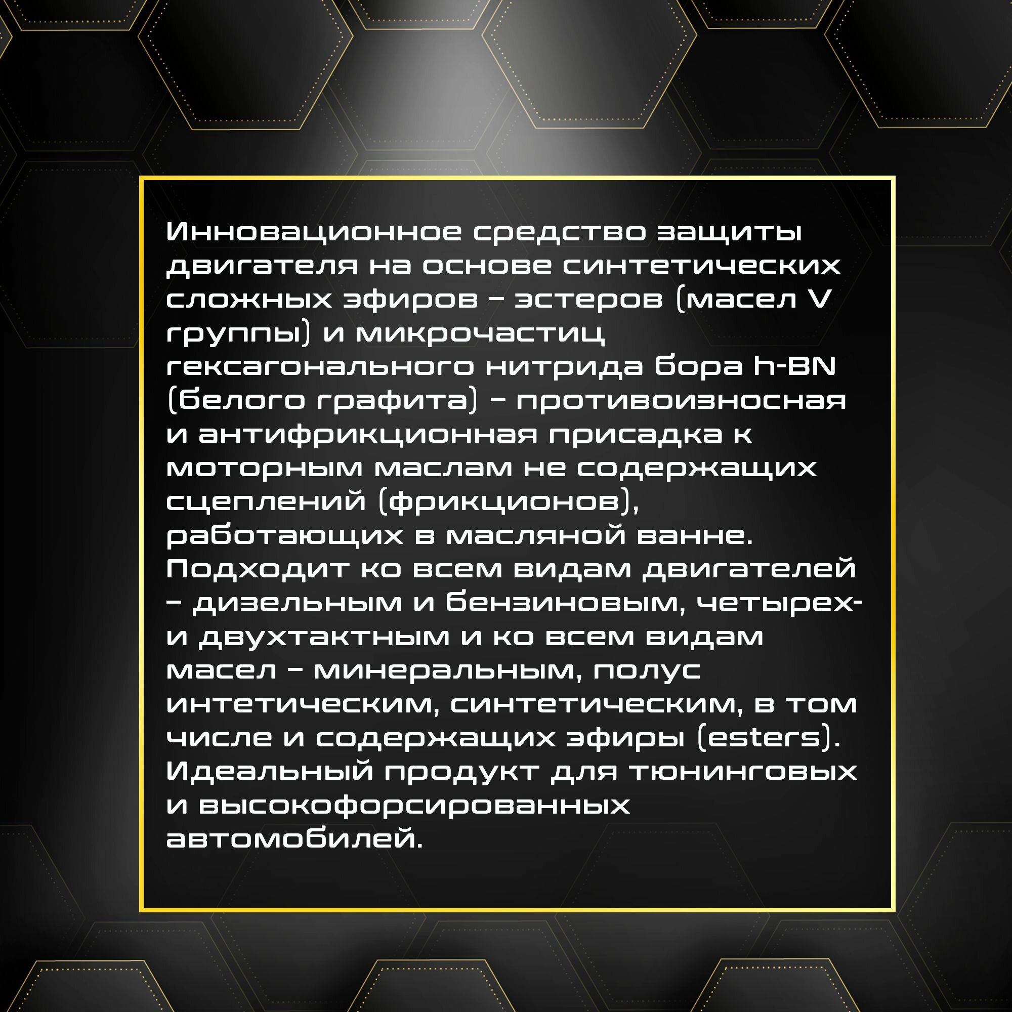 | Действие | защита двигателя при "холодном" пуске / защита от коррозии / снижение расхода масла / снижение трения / увеличение ресурса двигателя |