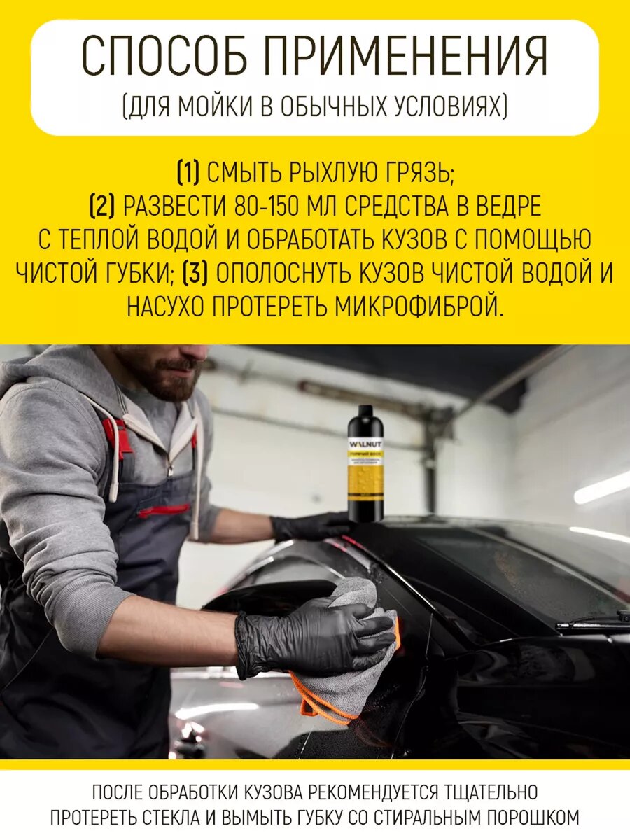 | Дополнительная информация | После обработки кузова рекомендуется тщательно протереть стекла авто и вымыть губку со стиральным порошком. |