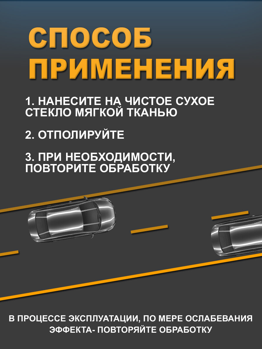 | Способ применения | 1 нанесите на чистое, сухое стекло мягкой тканью или микрофиброй. 2 Отполируйте 3 В случае образования разводов повторите обработку |