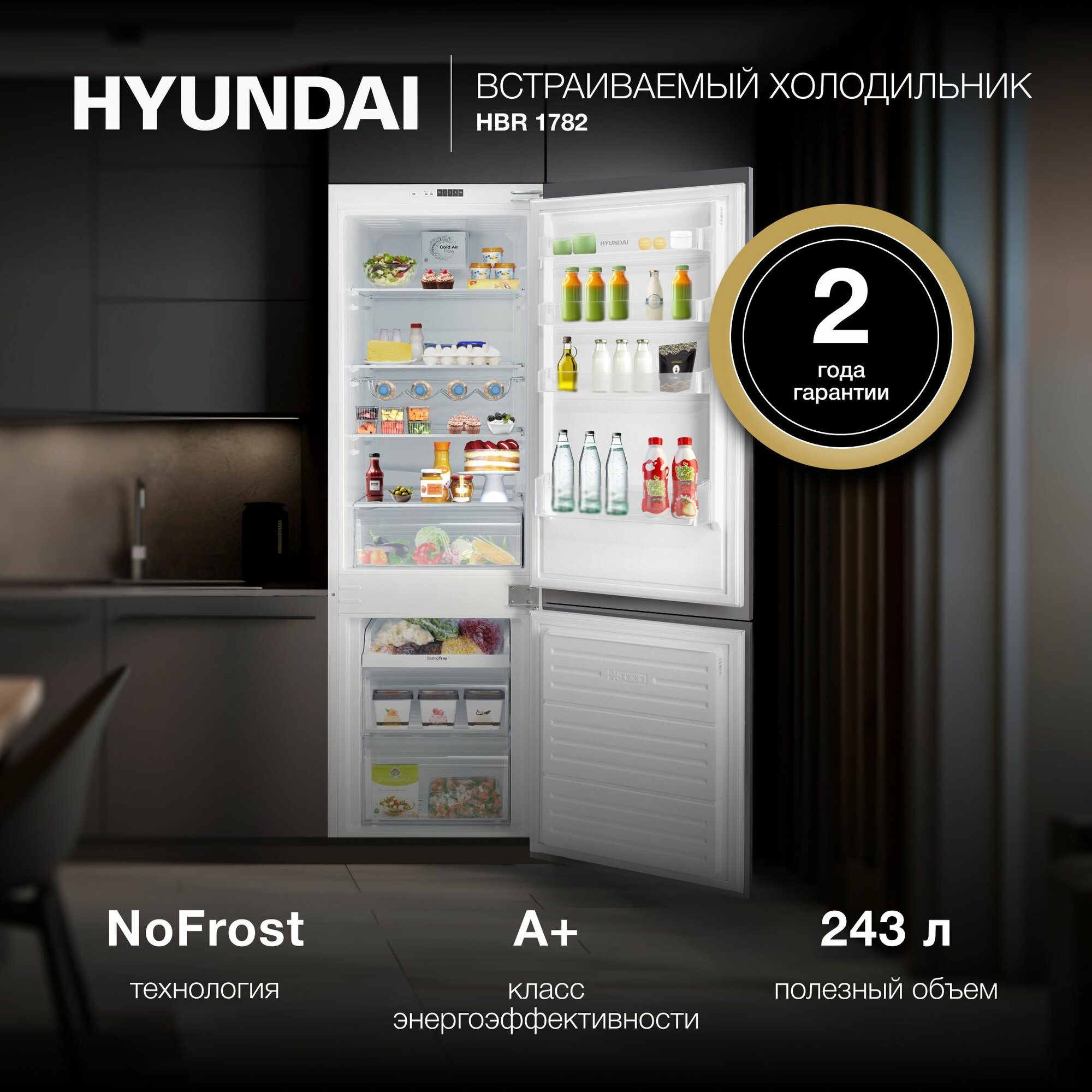 Холодильник двухкамерный встраиваемый Hyundai HBR 1782 с No Frost, Светло-серый, Белый интересное: