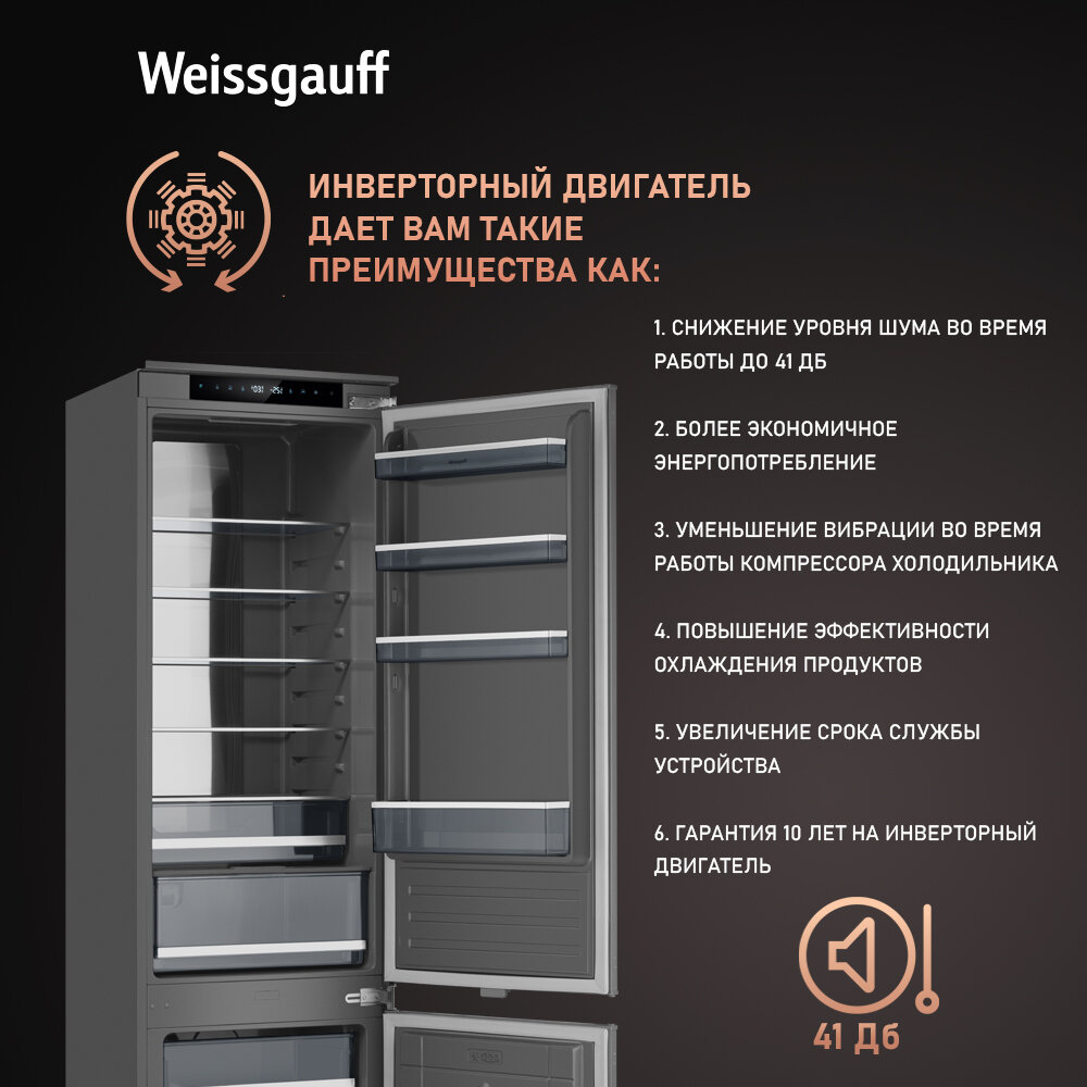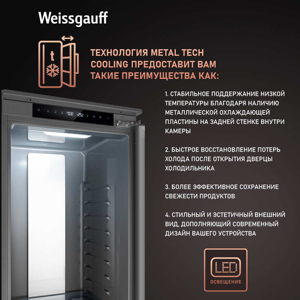 Встраиваемый холодильник с инвертором Weissgauff WRKI 2000 Total NoFrost Inverter Premium Ecofresh Inox Премиум отделка камеры, Зона свежести, Супер заморозка, Супер охлаждение, Сенсорное управление, LED-подсветка интересное: