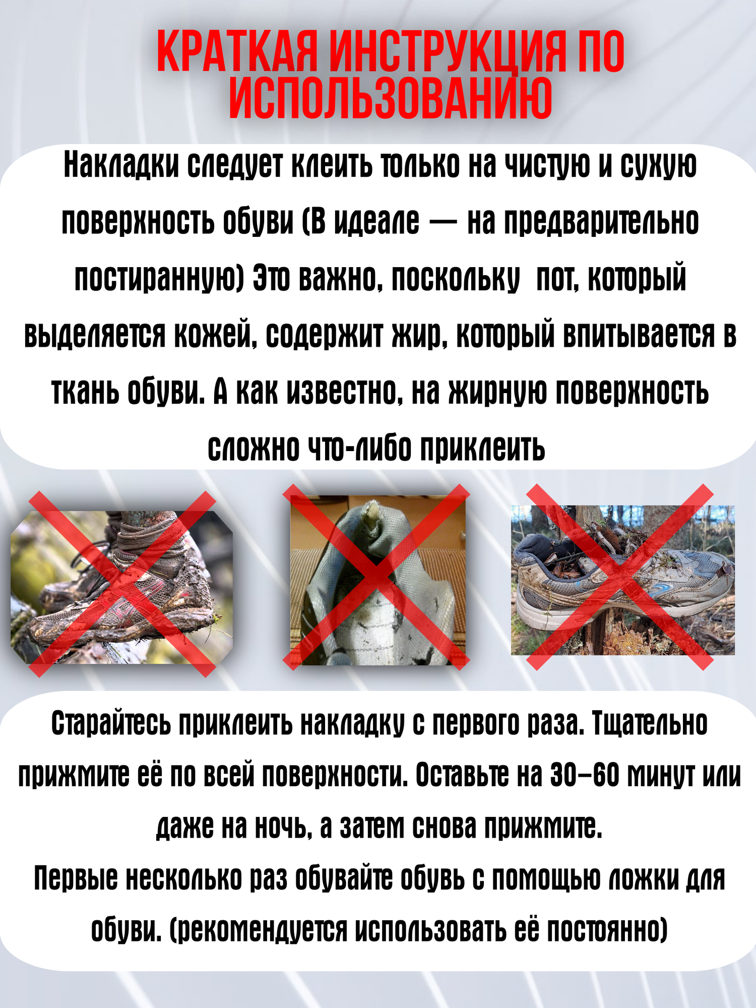 | Дополнительная информация | Используйте запятники и у вас всегда будут гладкие пяточки или используйте для ремонта, чтобы ваша обувь не протиралась и оставалась, как новая. |