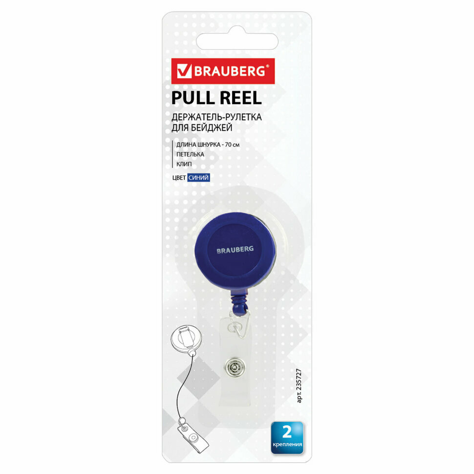 Купить Держатель-рулетка для бейджей Brauberg 70 см, петелька, клип, синий, в блистере (235727)