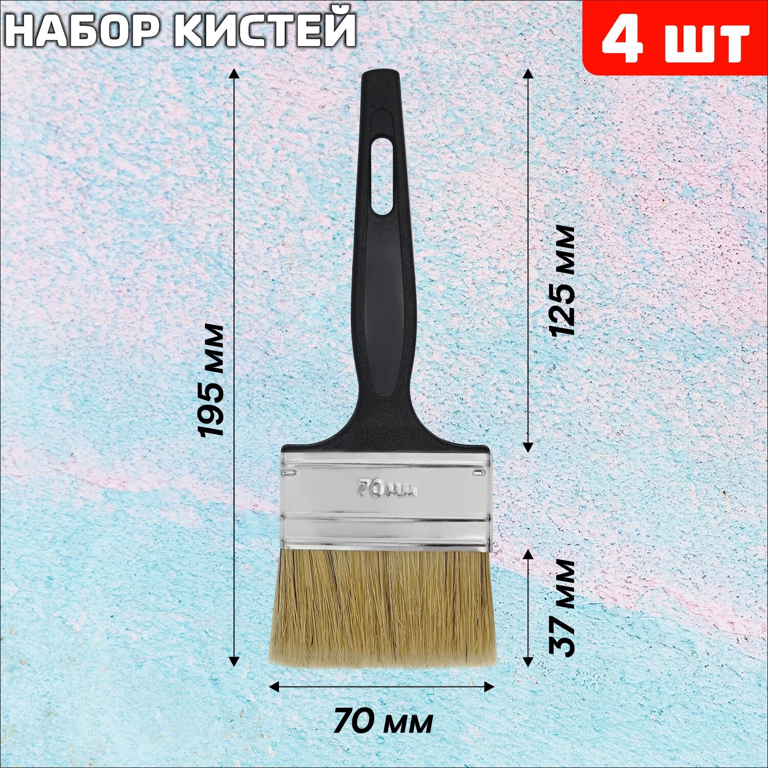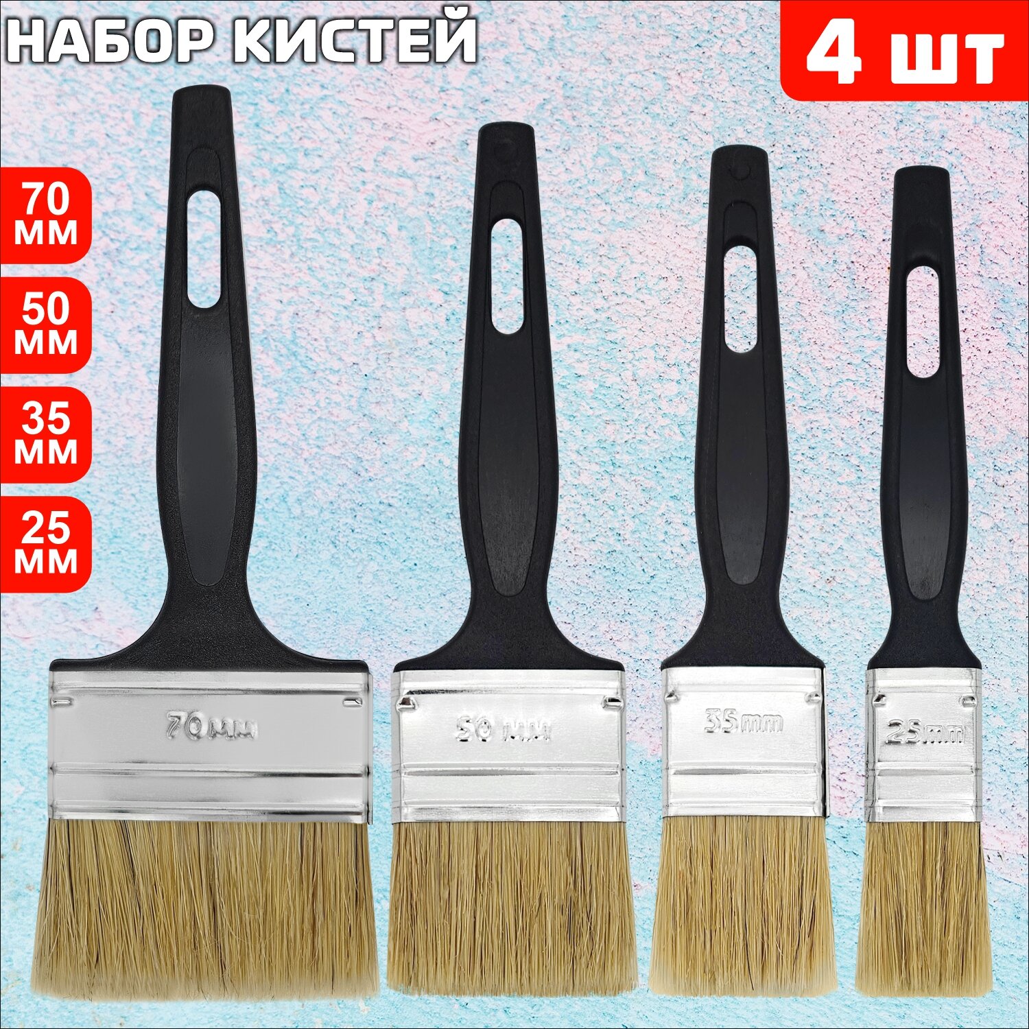 | Комплектация | Кисти малярные флейцевые 4 шт., 70 мм, 50 мм, 35 мм, 25 мм |
