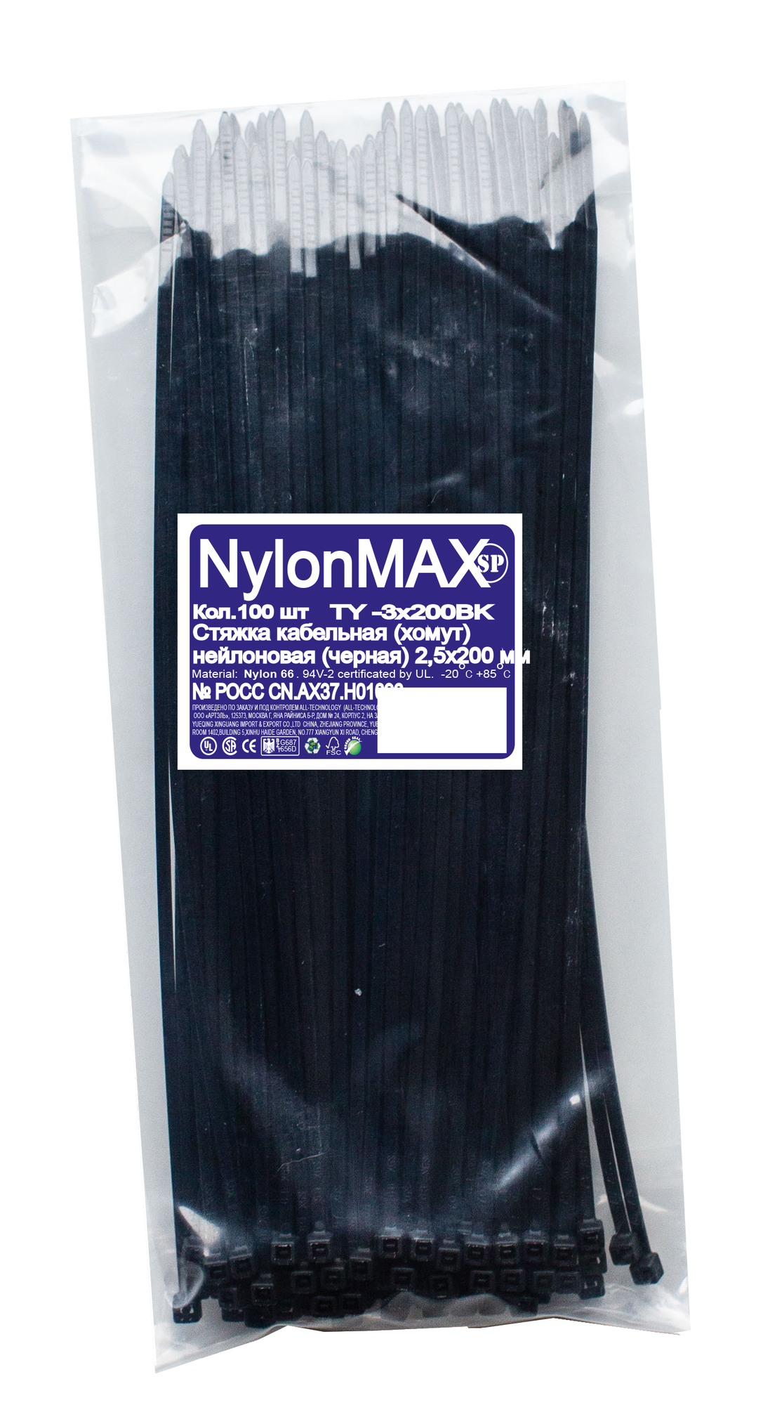 Купить Стяжка кабельная (хомут) нейлоновая NylonMAX, 3х200, черный, 100 шт.