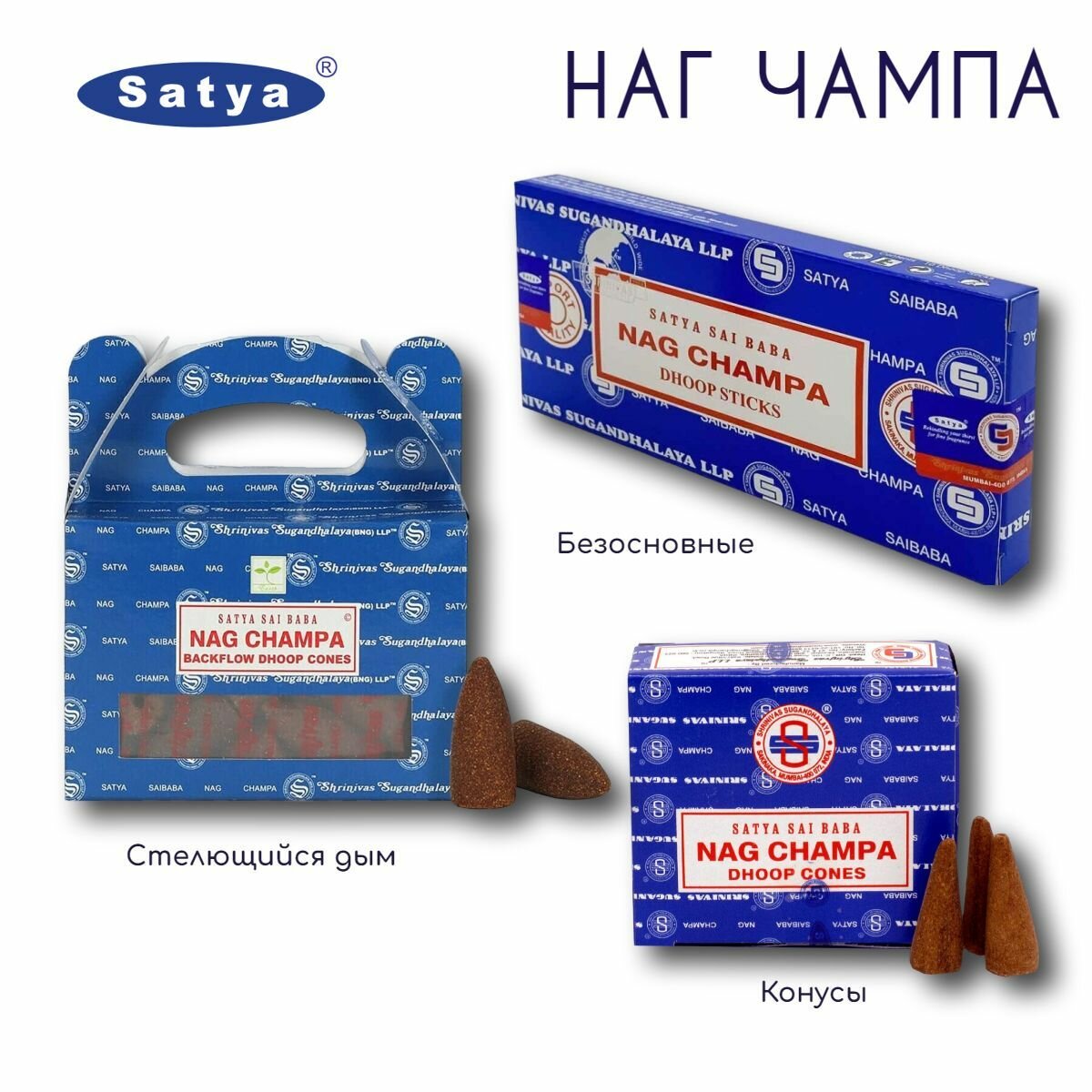 СохранитьНабор Satya Наг Чампа - палочки 10 шт, конусы 12 шт, пули (стелющийся дым) 24 шт, ароматические благовония, безосновные - Nag Champa - Сатия, Сатья интересное: