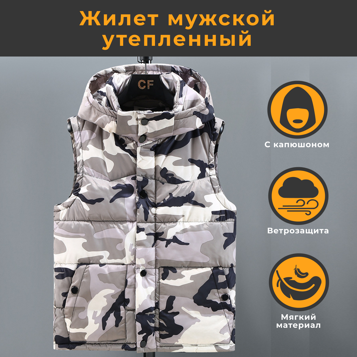 Жилет мужской утепленный камуфляж (цвет WhiteCAMO размер 4XL) с капюшоном, с карманами, для охоты и рыбалки интересное:
