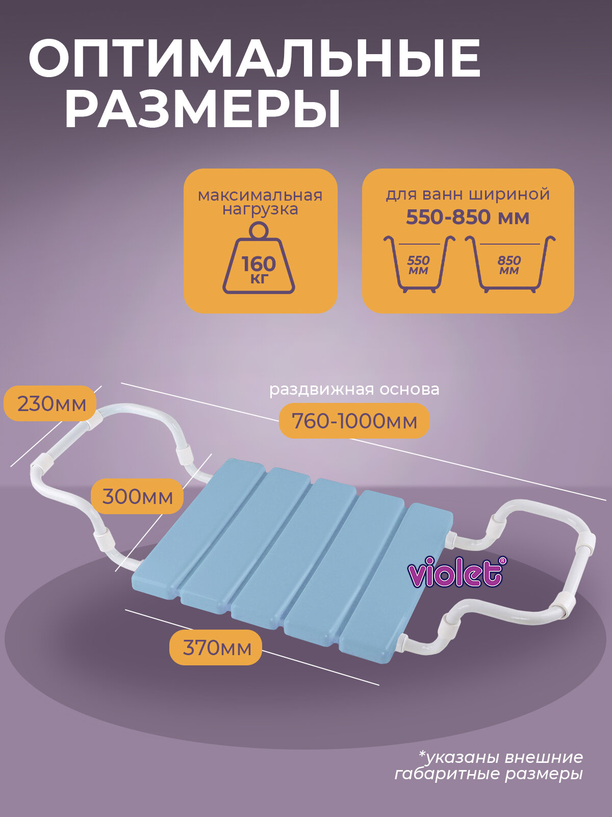 Сиденье в ванну раздвижное Violet, пластиковое, металлический каркас, серое