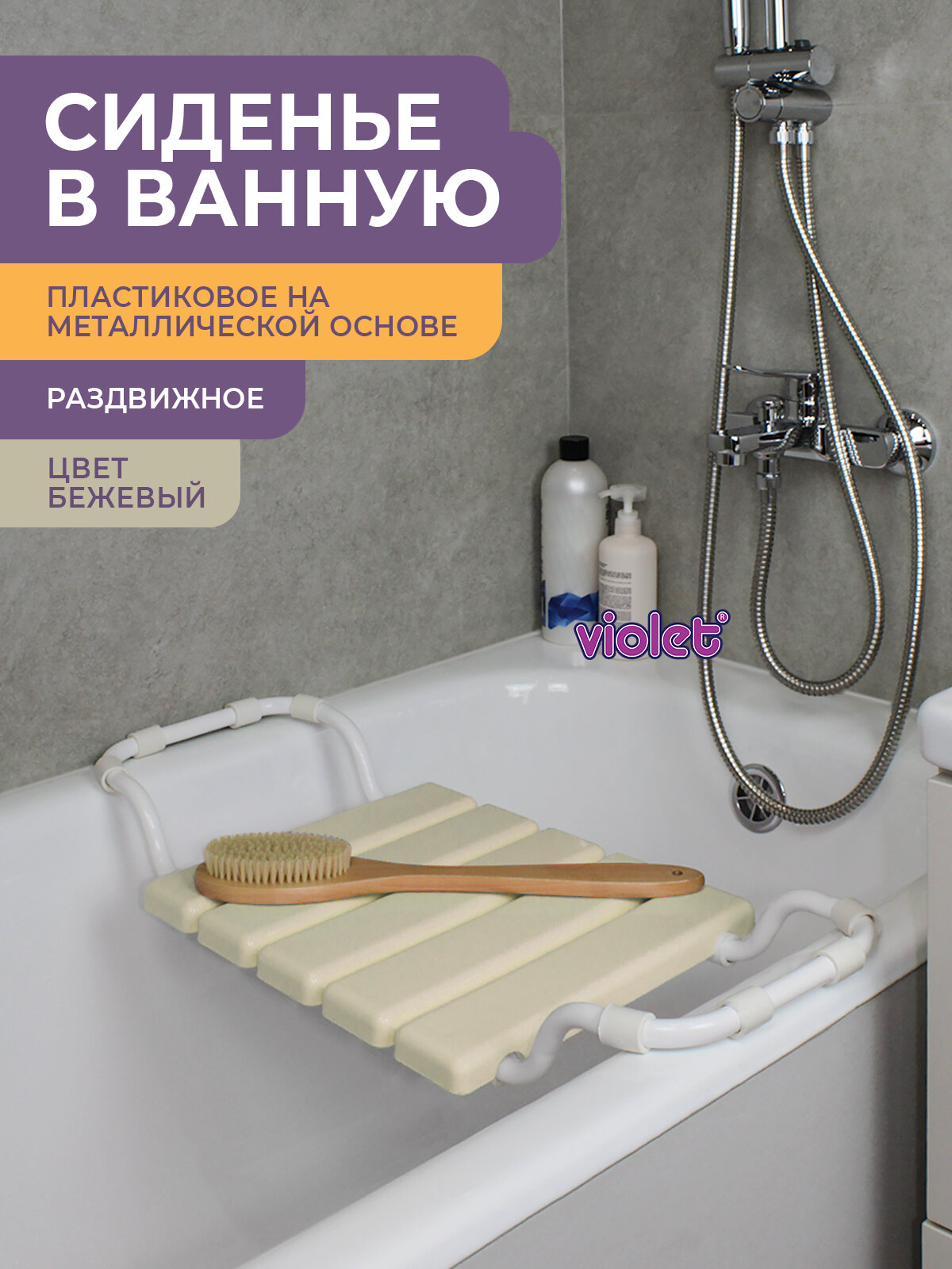 Сиденье в ванну раздвижное Violet, пластиковое, металлический каркас, серое