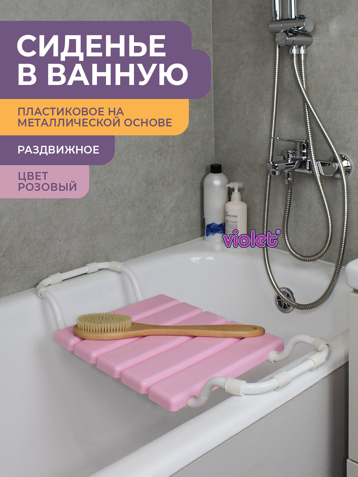Сиденье в ванну раздвижное Violet, пластиковое, металлический каркас, серое