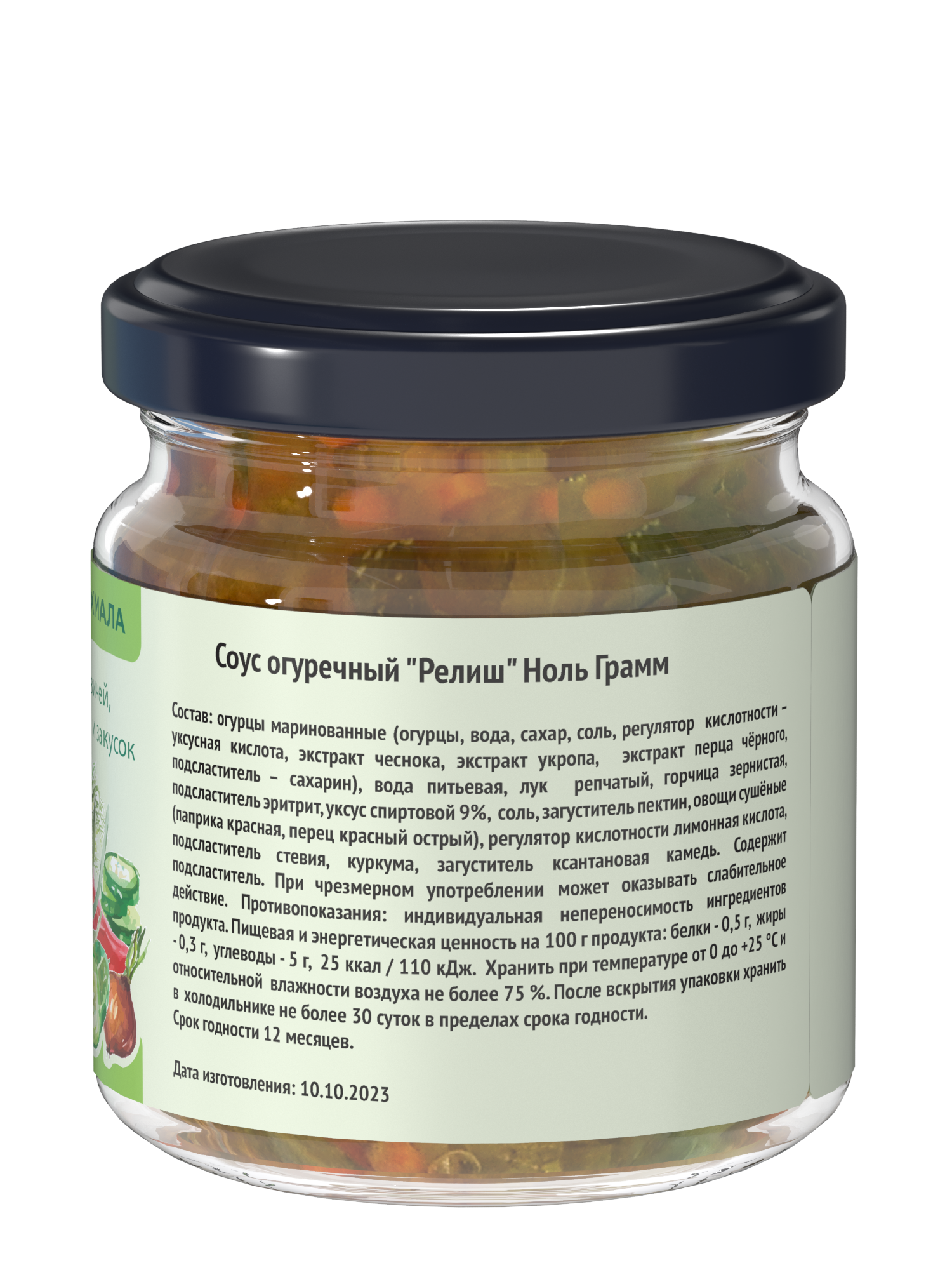 | Состав | огурцы маринованные (огурцы, вода, сахар, соль, регулятор кислотности - уксусная кислота, экстракт чеснока, экстракт укропа, экстракт перца чёрного, подсластитель - сахарин), вода питьевая, лук репчатый, горчица зернистая, подсластитель эритрит, уксус спиртовой 9%, соль, загуститель пектин, овощи сушеные (Паприка красная, перец красный острый), регулятор кислотности лимонная кислота, подсластитель стевия, куркума, загуститель ксантановая камедь. Содержит подсластитель. При чрезмерном употреблении может оказывать слабительное действие. Противопоказания: индивидуальная непереносимость ингредиентов продукта. |