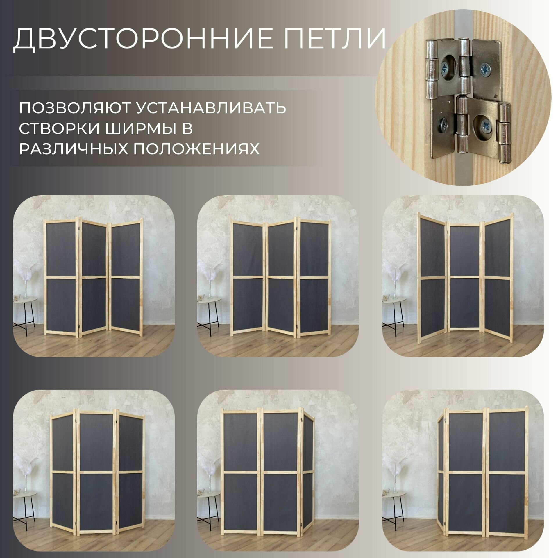 Ширма перегородка для зонирования комнаты. Рама из натурального дерева. 3 створки.