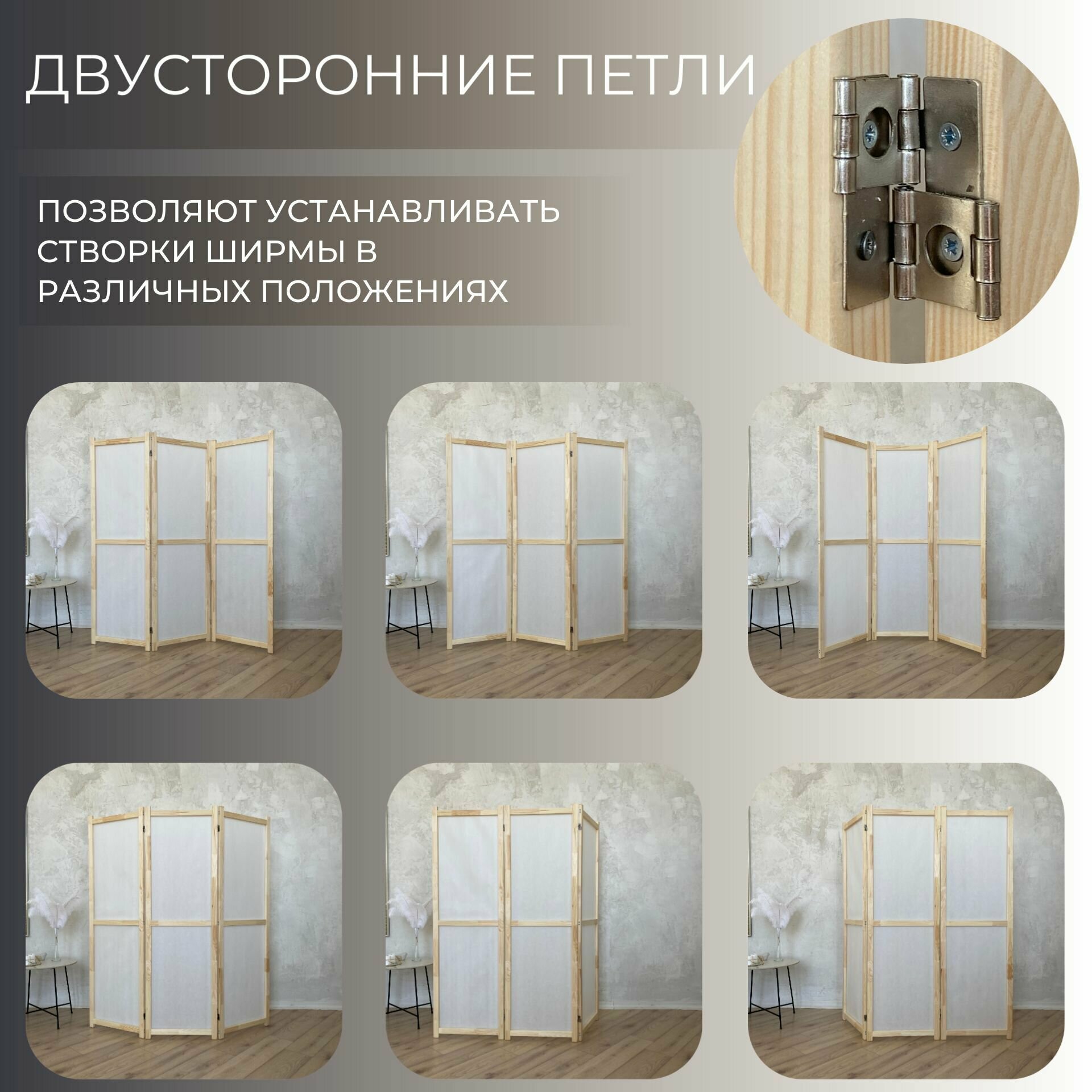 Ширма перегородка для зонирования комнаты. Рама из натурального дерева. 3 створки.