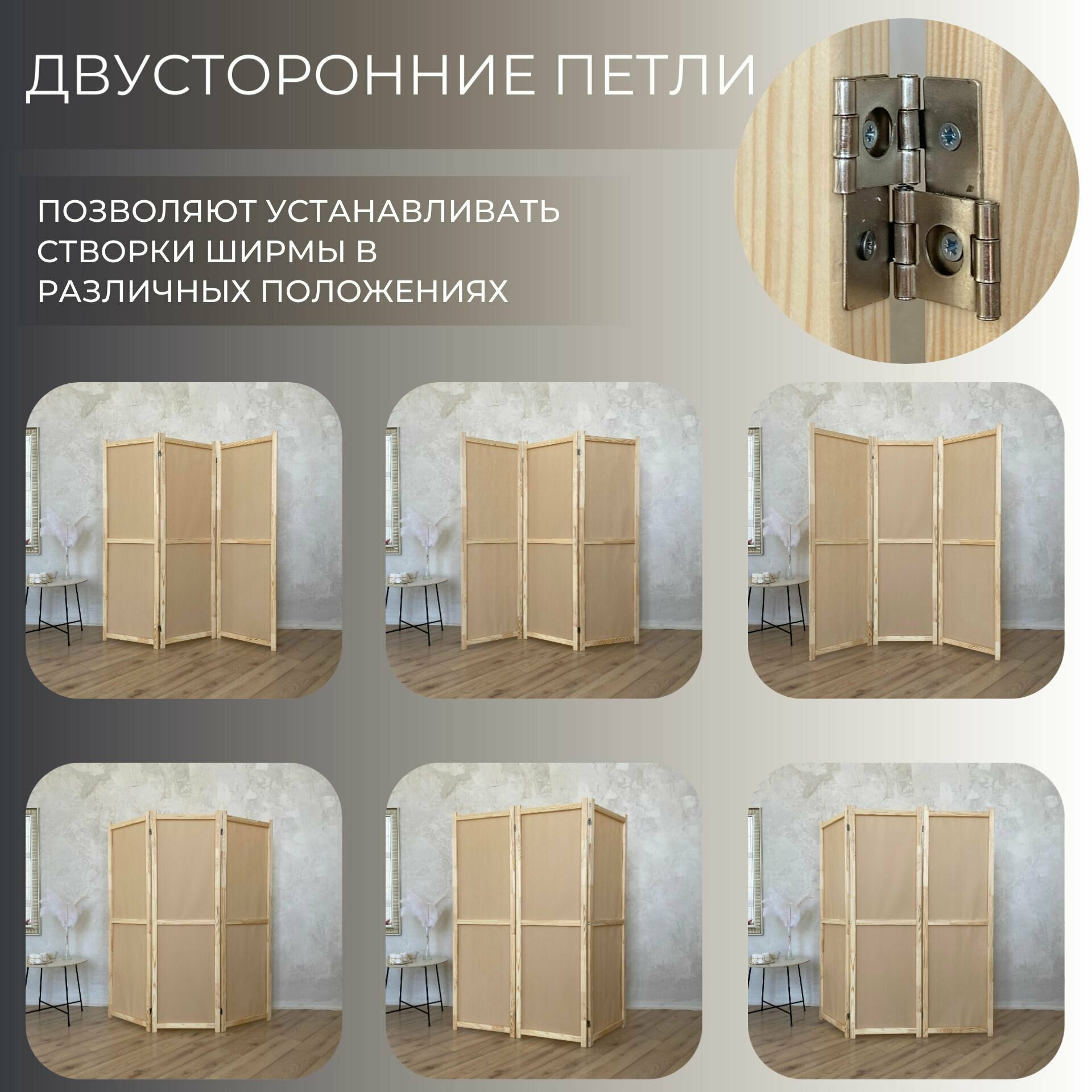 Ширма перегородка для зонирования комнаты. Рама из натурального дерева. 3 створки.