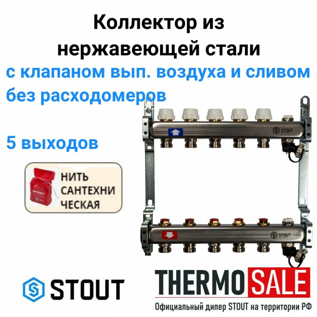 Купить Коллектор из нержавеющей стали без расходомеров, с клапаном вып. воздуха и сливом 5 вых. STOUT SMS-0932-000005