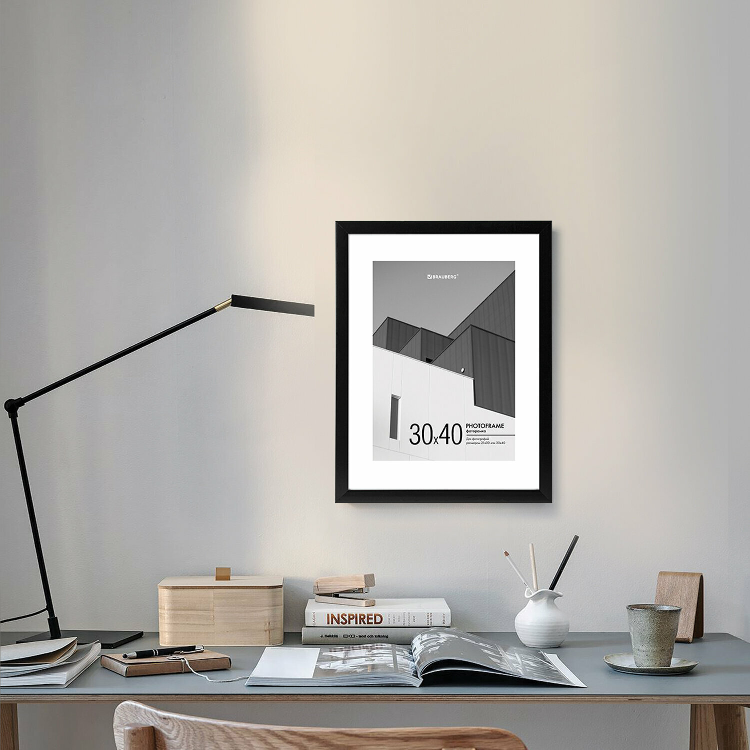 Купить Рамка (фоторамка) для фото, фотографий, картин, грамот на стену А3 30х40, с паспарту А4 21х30, небьющаяся, багет, пластик, Brauberg, черная, 391277