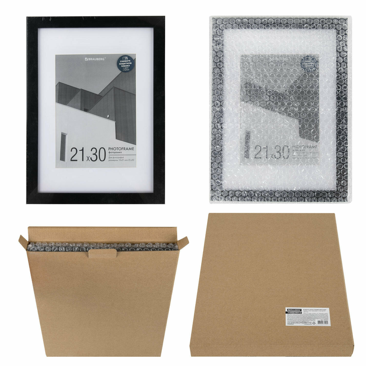 Рамка (фоторамка) для фото, фотографий, картин, грамот на стену А3 30х40, с паспарту А4 21х30, небьющаяся, багет, пластик, Brauberg, черная, 391277