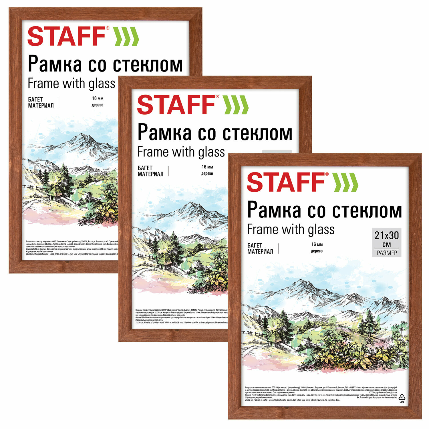 Рамка для фото А4, фоторамка 21х30 см для фотографий, картин, грамот, вышивки со стеклом набор 3 штуки, багет 16мм натуральное дерево, Staff, цвет орех, 391387 интересное: