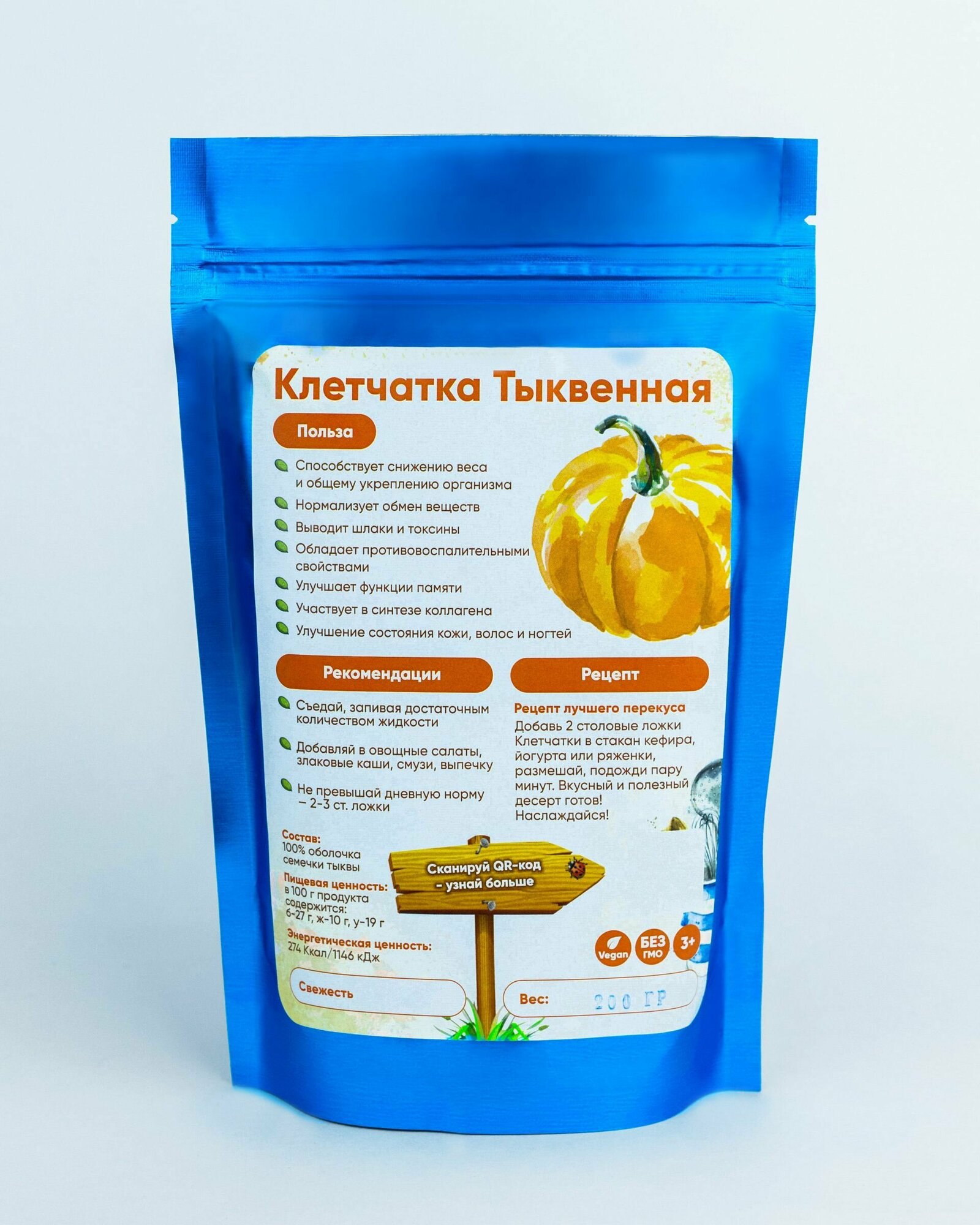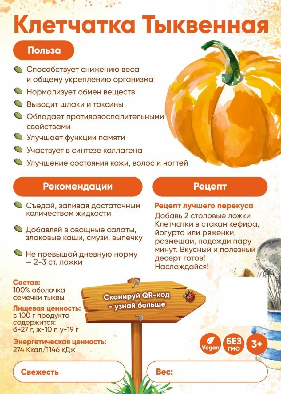 | Дополнительная информация | Клетчатка из тыквы незаменима для похудения, для снижения веса, очищения и детокса, веганов или вегетарианцев, просто для правильного здорового питания. |
