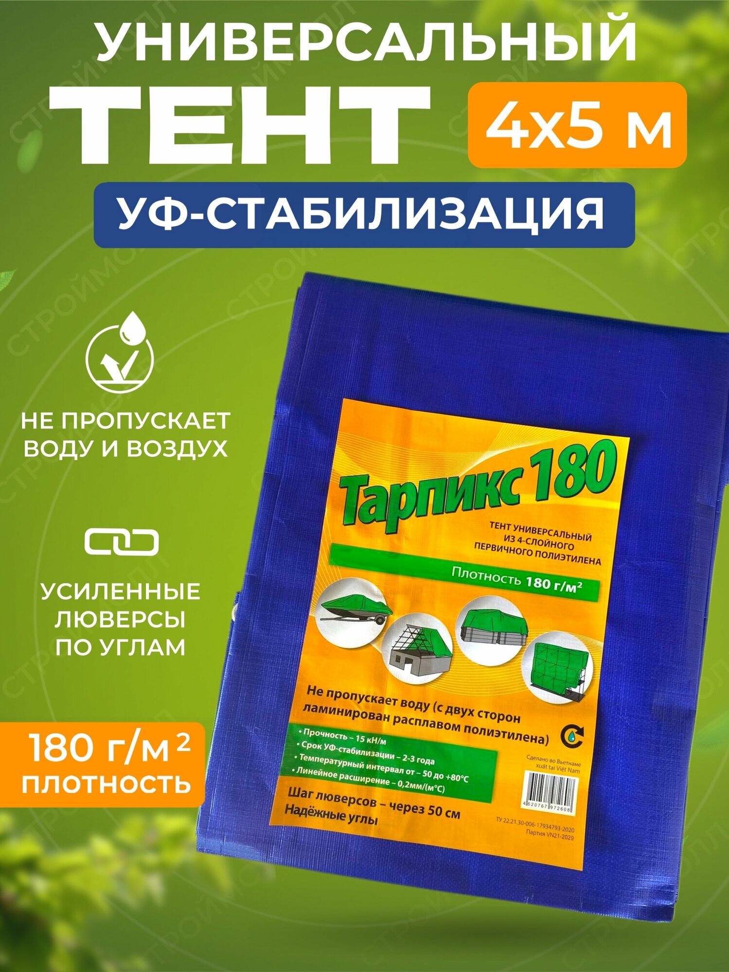 Ниже Вы можете прочитать отзывы на Тент универсальный плотность 180г/м2 (4 х 5м) Тарпикс, ознакомится с подробными характеристиками, посмотреть интересные обзоры и фотографии на Тент универсальный плотность 180г/м2 (4 х 5м) Тарпикс.