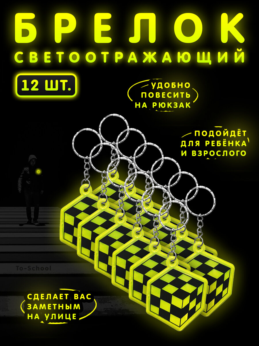 Купить Брелок светоотражающий / фликер / светоотражатель на рюкзак, сумку, одежду - набор из 12 штук - Кубик (желтый)