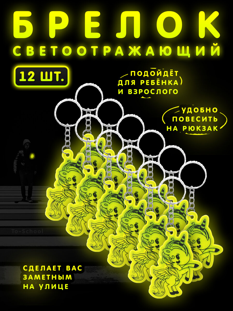 Купить Брелок светоотражающий / фликер / светоотражатель на рюкзак, сумку, одежду - набор из 12 штук - Единорожка (желтый)