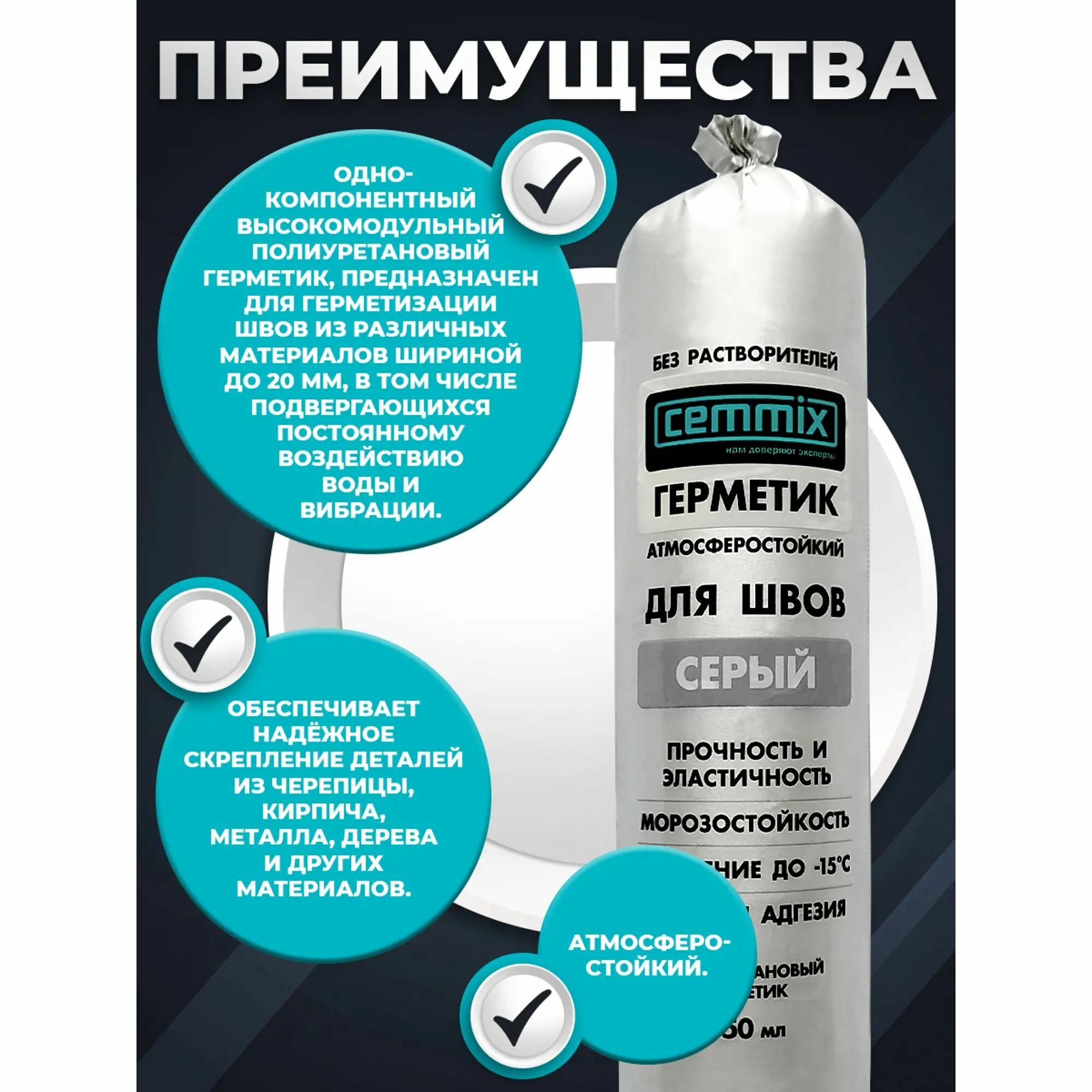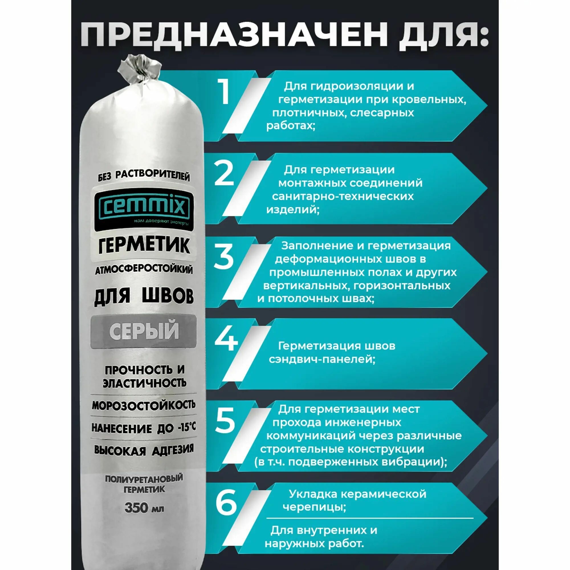 | Подробная комплектация | Клей-герметик для швов Cemmix 350 мл серый |