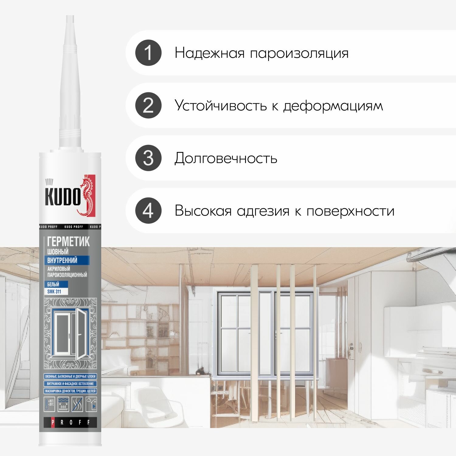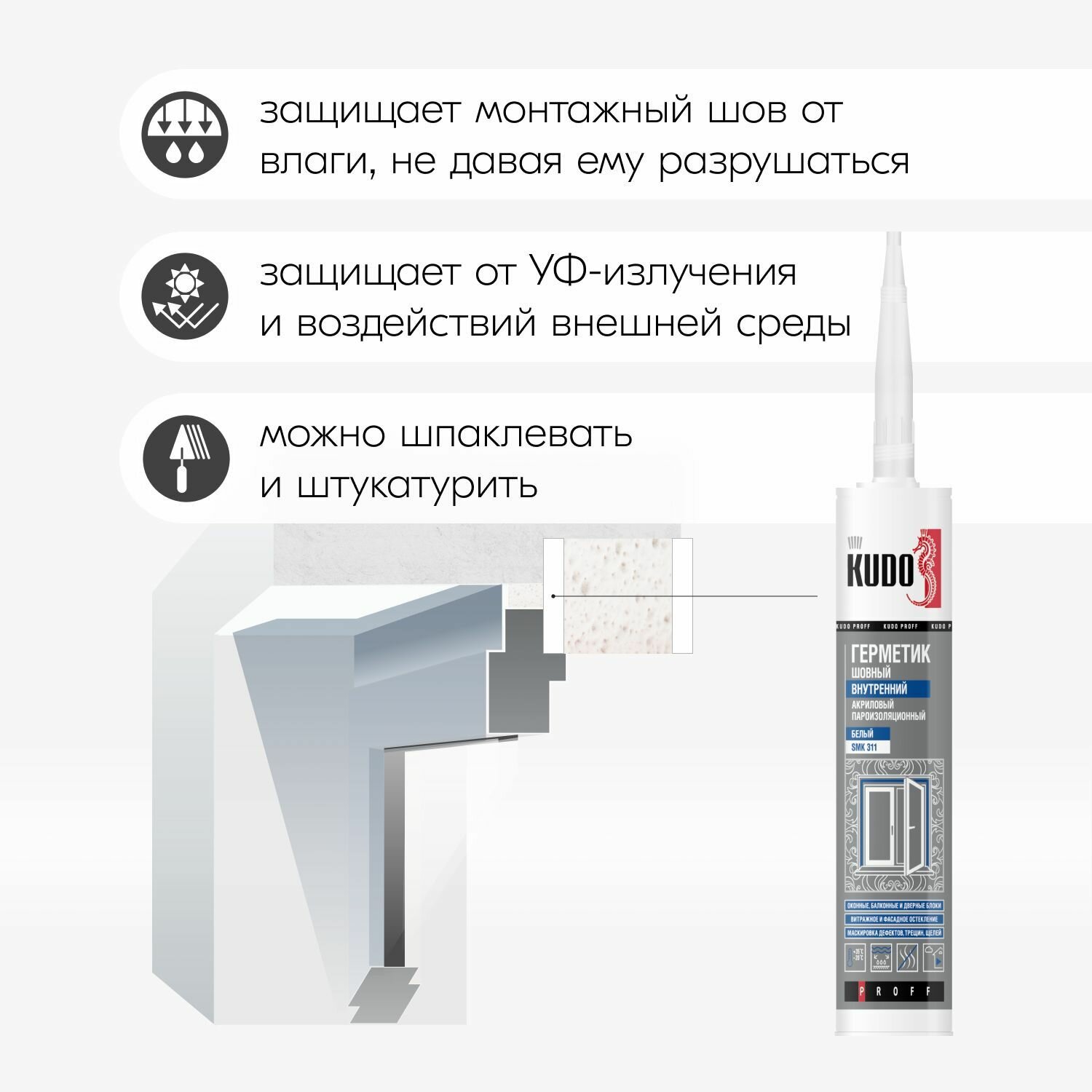 Герметик акриловый KUDO PROFF, внутренний, пароизоляционный шовный, для монтажной пены при монтаже окон, SMP-311, 600 мл, белый