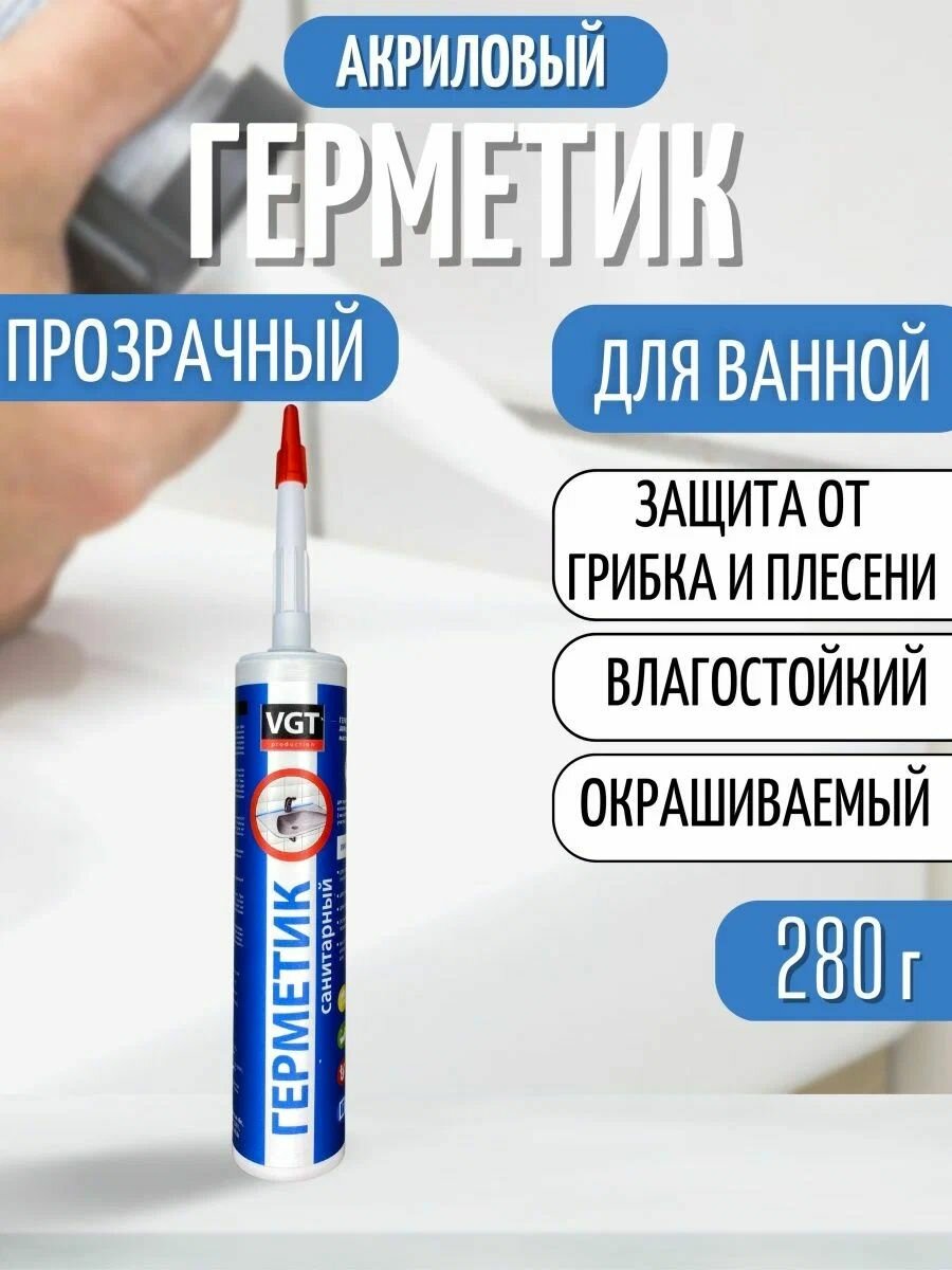 VGT герметик акриловый санитарный для внутренних и наружных работ, картридж, бесцветный (280мл)