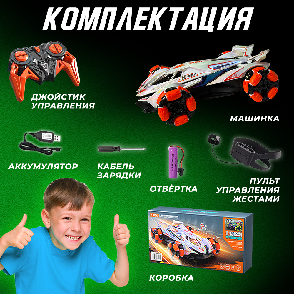 | Комплектация | радиоуправляемая машинка, пульт управления, браслет управления жестами, аккумулятор, зарядное устройство, отвертка |