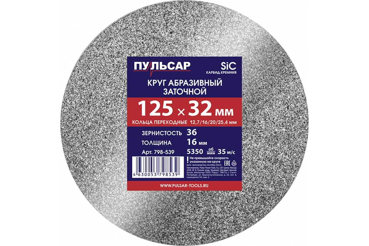 | Комплектация | Диск абразивный для точила ПУЛЬСАР 125 х 32 х 16 мм F 36 серый (SiC) + кольца переходные |