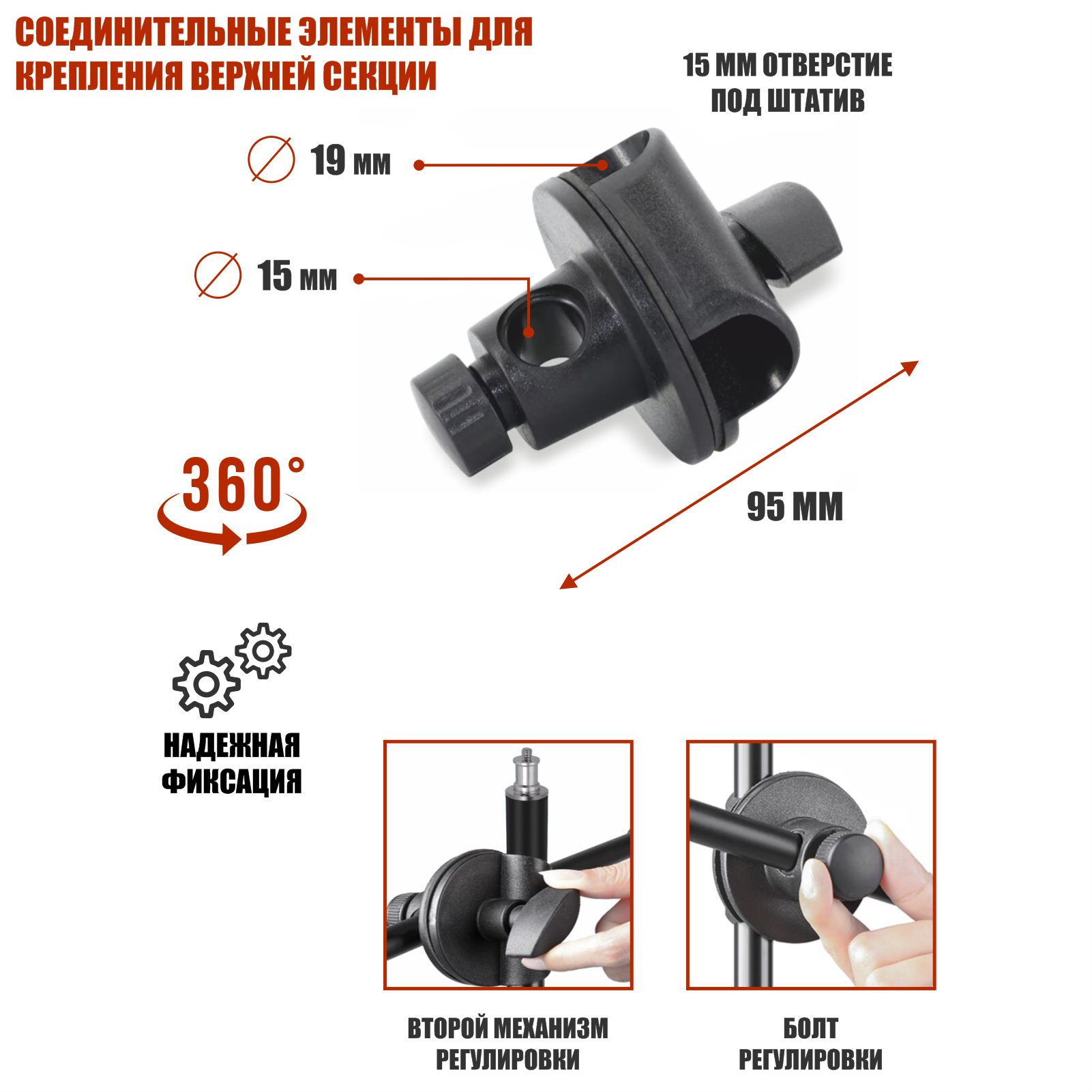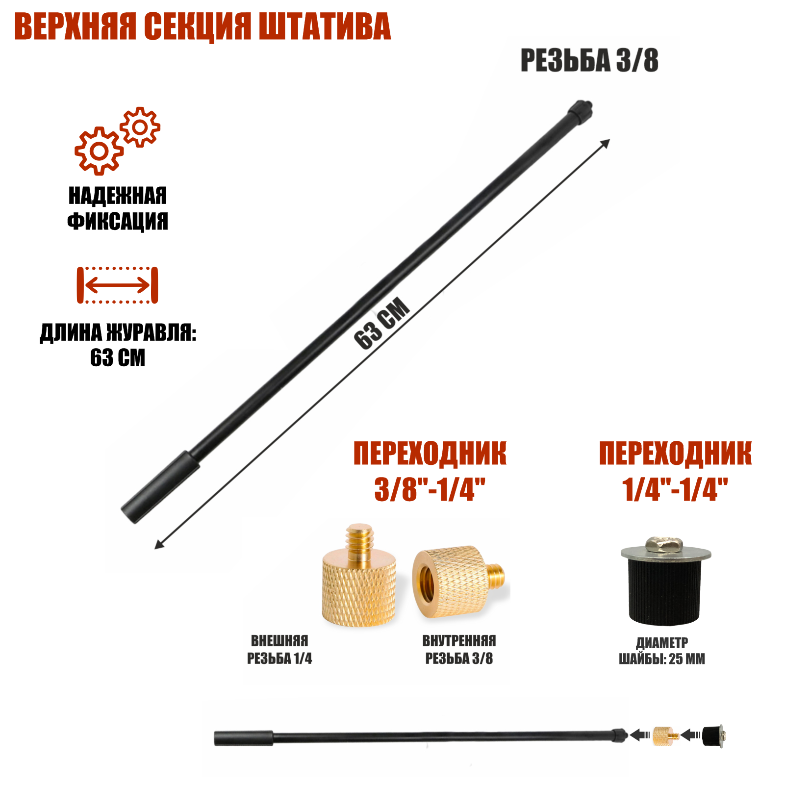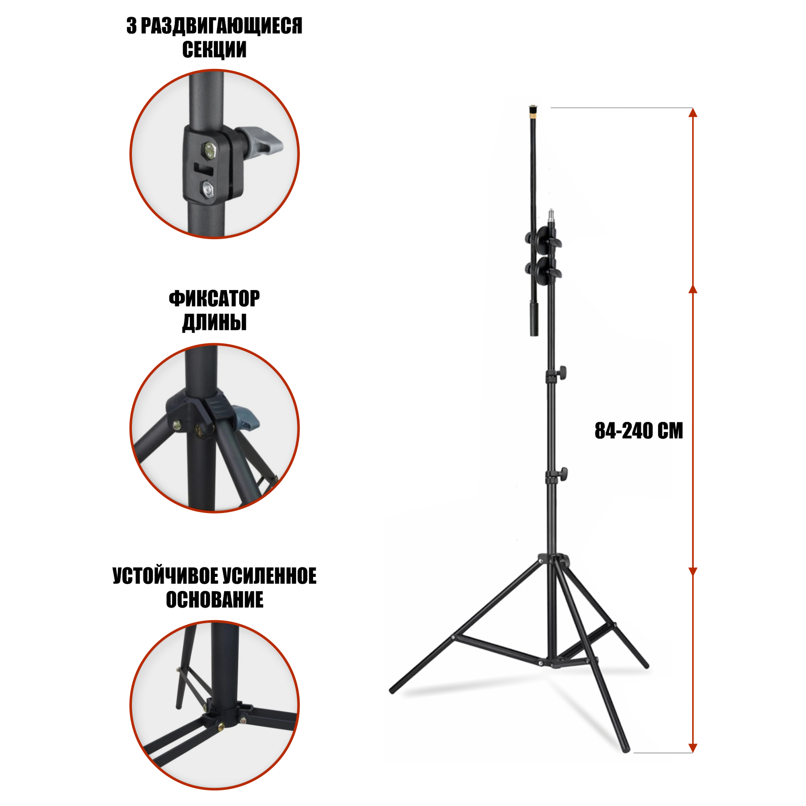 | Дополнительная информация | Блокировка секций штатива осуществляется поворотным фиксатором, обеспечивая быструю установку стойки на необходимую высоту |