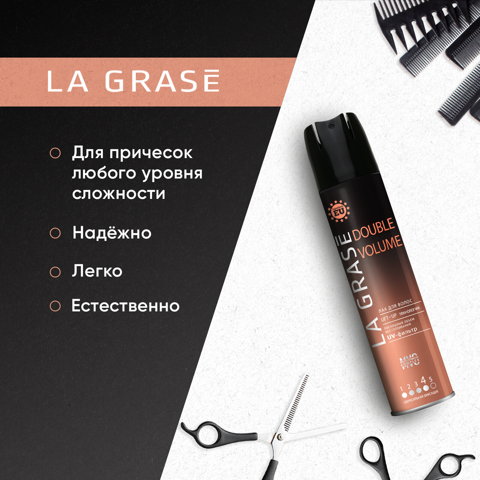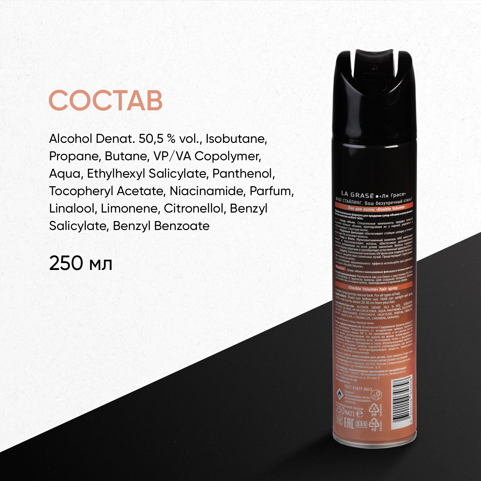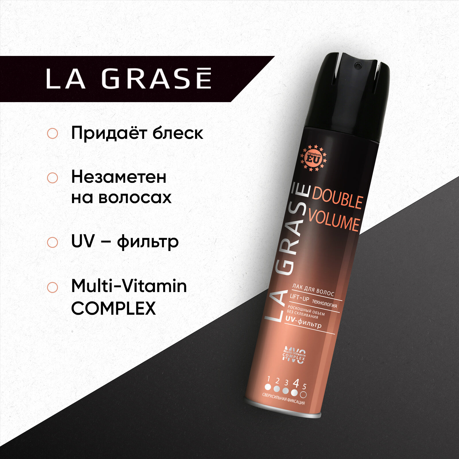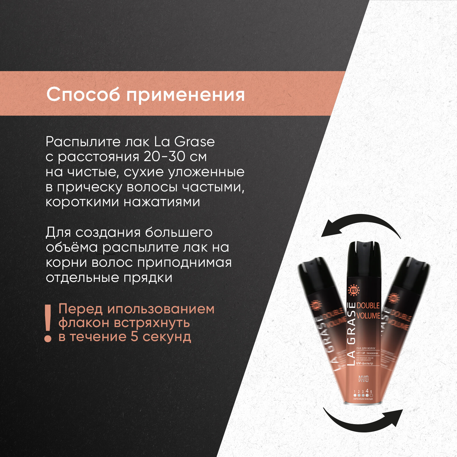 | Способ применения | распылите лак La Grase с расстояния 20-30 см на уложенные в причёску волосы. Для создания большего объёма распылите лак на корни волос, приподнимая отдельные пряди |