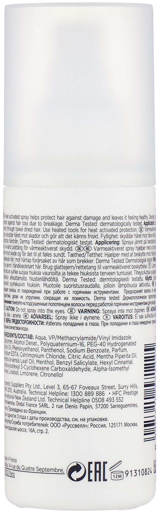 | Способ применения | равномерно распределите на подсушенных полотенцем волосах и расчешите их. Высушите феном и используйте горячий инструмент для активации защитного действия спрея. Придайте прическе необходимую форму. Рекомендуется для всех типов волос в качестве первого этапа защиты волос перед укладкой |
