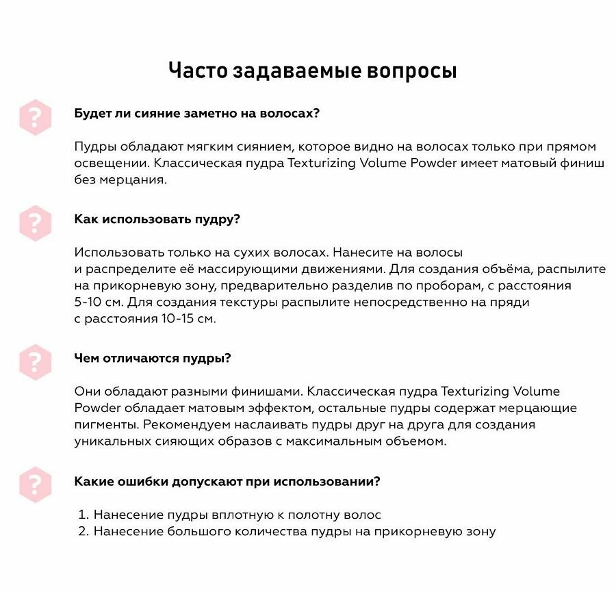 | Способ применения | Для создания объёма распылите на прикорневую зону с расстояния 5-10 см. Для создания текстуры распылите непосредственно на пряди с расстояния 10-15 см и распределите ее пальцами. Используйте только на сухих волосах. |
