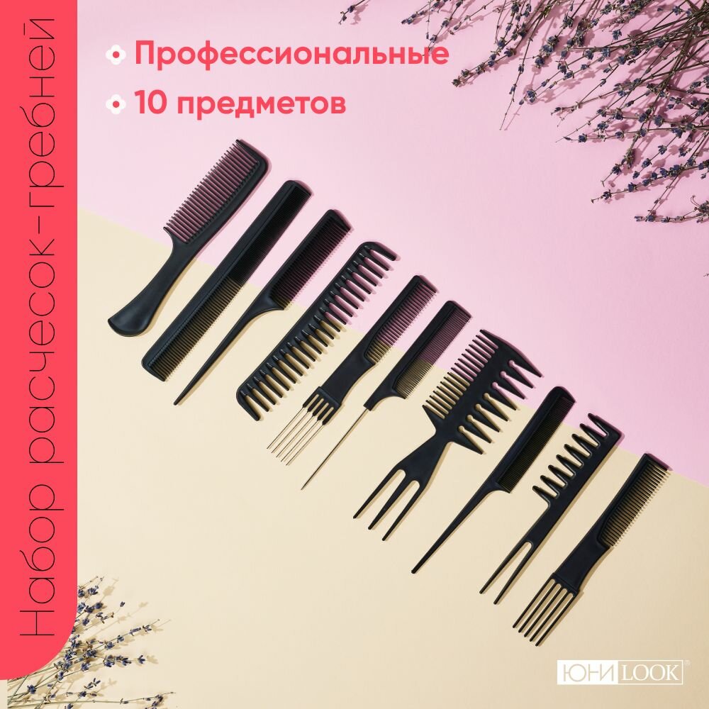Набор профессиональных расчесок-гребней ЮниLook 10пр, пластик, черный