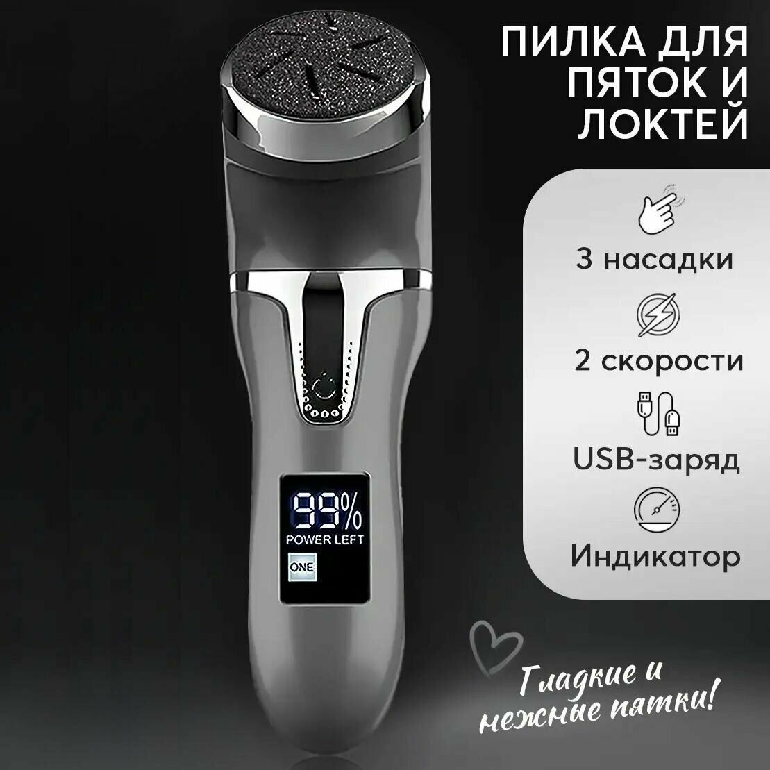 | Дополнительная информация | 1) Выбор насадки для шлифовки, он основывается на степени шероховатости вашей кожи и ожидаемом эффекте от процедуры. 2) Необходимо нажать и удерживайте переключатель в течение 2-3 секунд, чтобы включить аппарат. 3) Нажмите переключатель один раз, чтобы перейти на более высокую скорость. 4) Перемещайте вперед, назад или влево и вправо шлифовальную насадку на сухой и шероховатой поверхности кожи. 5) Используйте аппарат до тех пор, пока не будет достигнут эффект. 6) После использования нажмите и удерживайте переключатель в течение 2-3 секунд, чтобы выключить аппарат. 7) Помойте кожу или используйте влажное полотенце, чтобы удалить пыль от удаленной кожи, и нанесите немного крема для увлажнения ног. 8) Вставьте штекер в гнездо для зарядки в нижней части устройства, а другой конец вставьте в USB интерфейс для зарядки и использования в следующие сеансы. |