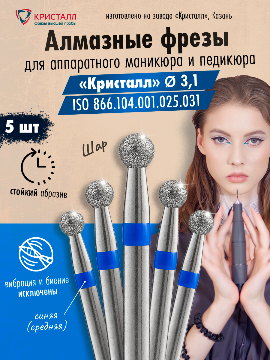 Кристалл, Алмазная фреза (Шар) D3,1, L025, средняя, 866.104.001.025.031, 5 шт интересное: