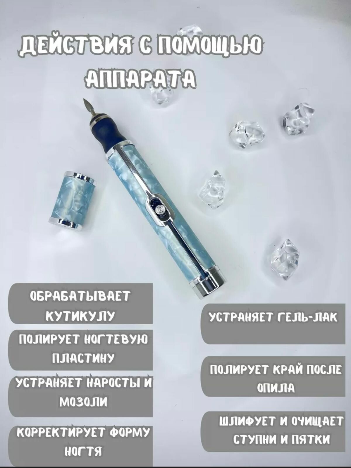 | Дополнительная информация | Обрабатывает кутикулу,Полирует ногтевую пластину,Устраняет наросты и мозоли,Корректирует форму ногтя,Шлифует и очищает ступни и пятки |