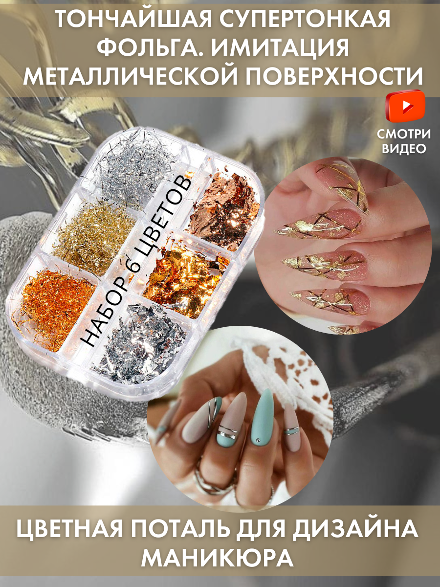 Декор для маникюра, цветная поталь для дизайна ногтей, аксессуары для маникюра, блестки (палетка 6 секций) интересное: