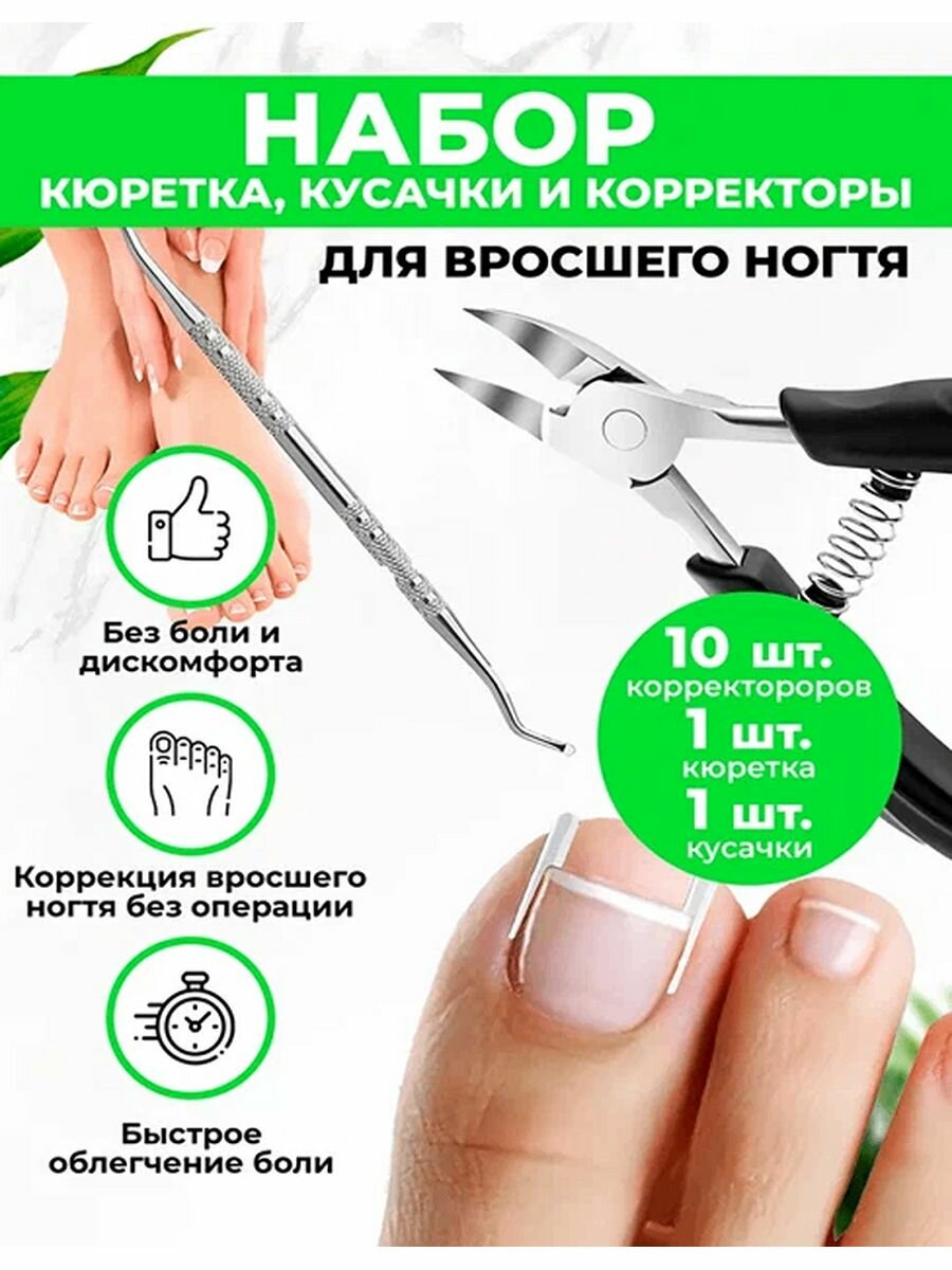 | Дополнительная информация | Комплектация: Корректоры от вросшего ногтя - 10 шт Кусачки - 1 шт Кюретка - 1 шт |