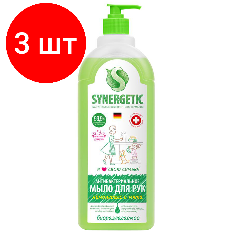 Комплект 3 шт, Мыло жидкое Synergetic "Лемонграсс и мята", биоразлагаемое, антибактер, антизапах, с дозатором, 1л