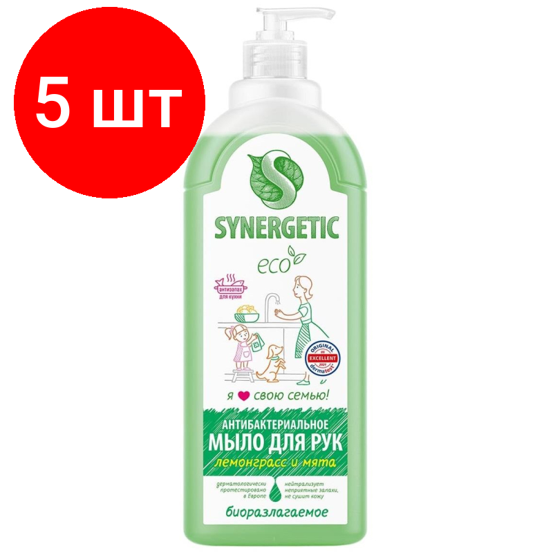 Комплект 5 штук, Мыло жидкое Synergetic антибактериальное, Лемонграсс и мята 500мл дозатор