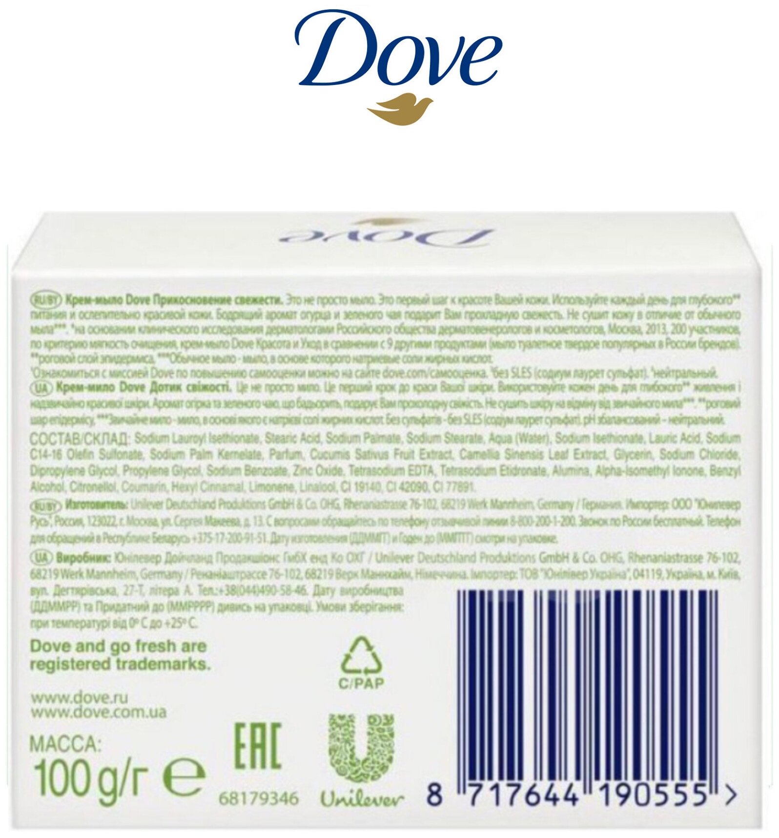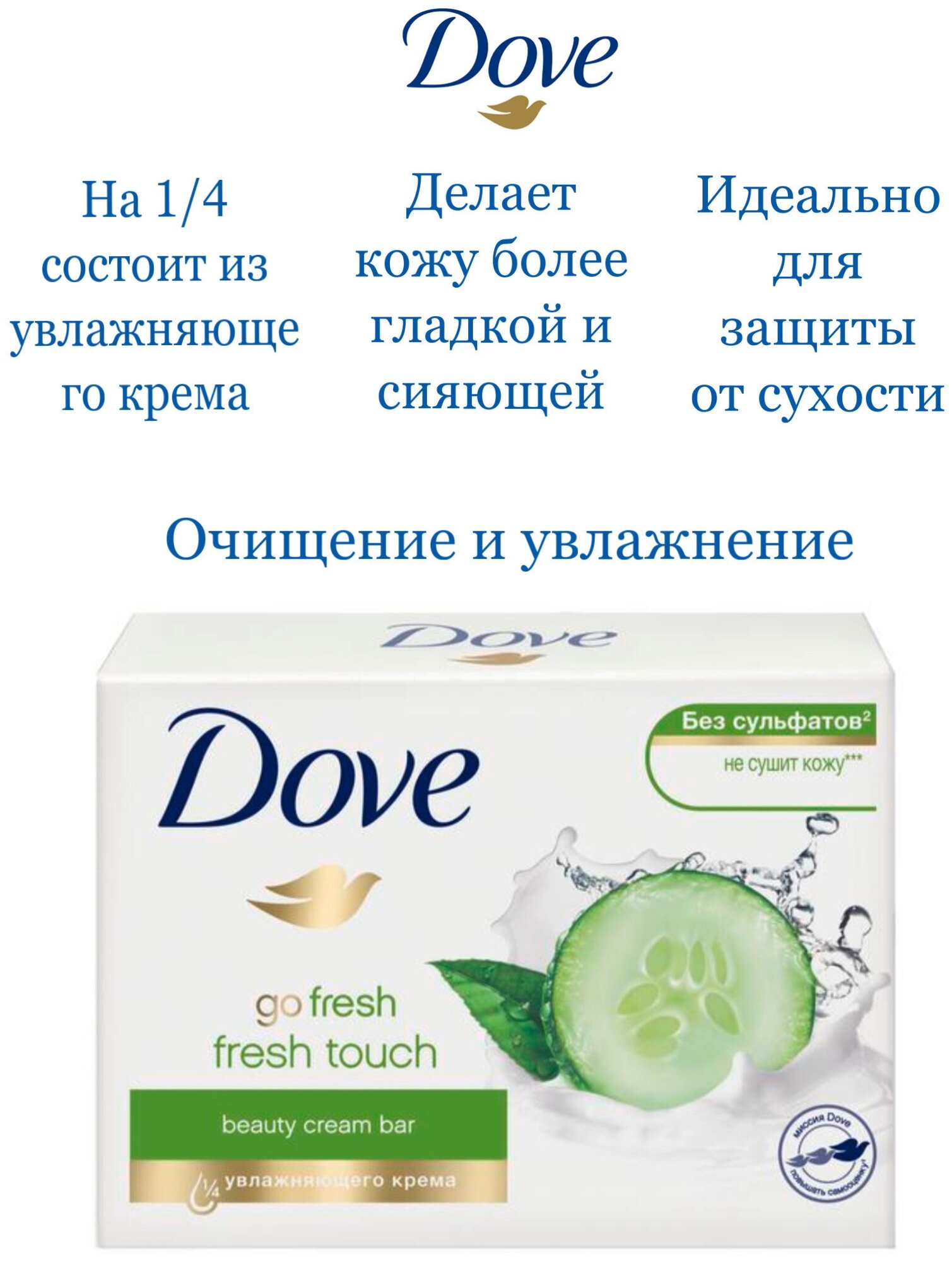 | Дополнительная информация | На 1/4 состоящее из увлажняющего крема, крем-мыло Dove питает Вашу кожу, делая ее более гладкой и сияющей. Не сушит кожу в отличие от обычного мыла. Нет ничего лучше, чем мягкая и гладкая как шелк кожа, и она может быть именно такой каждый день благодаря правильно подобранным косметическим средствам |