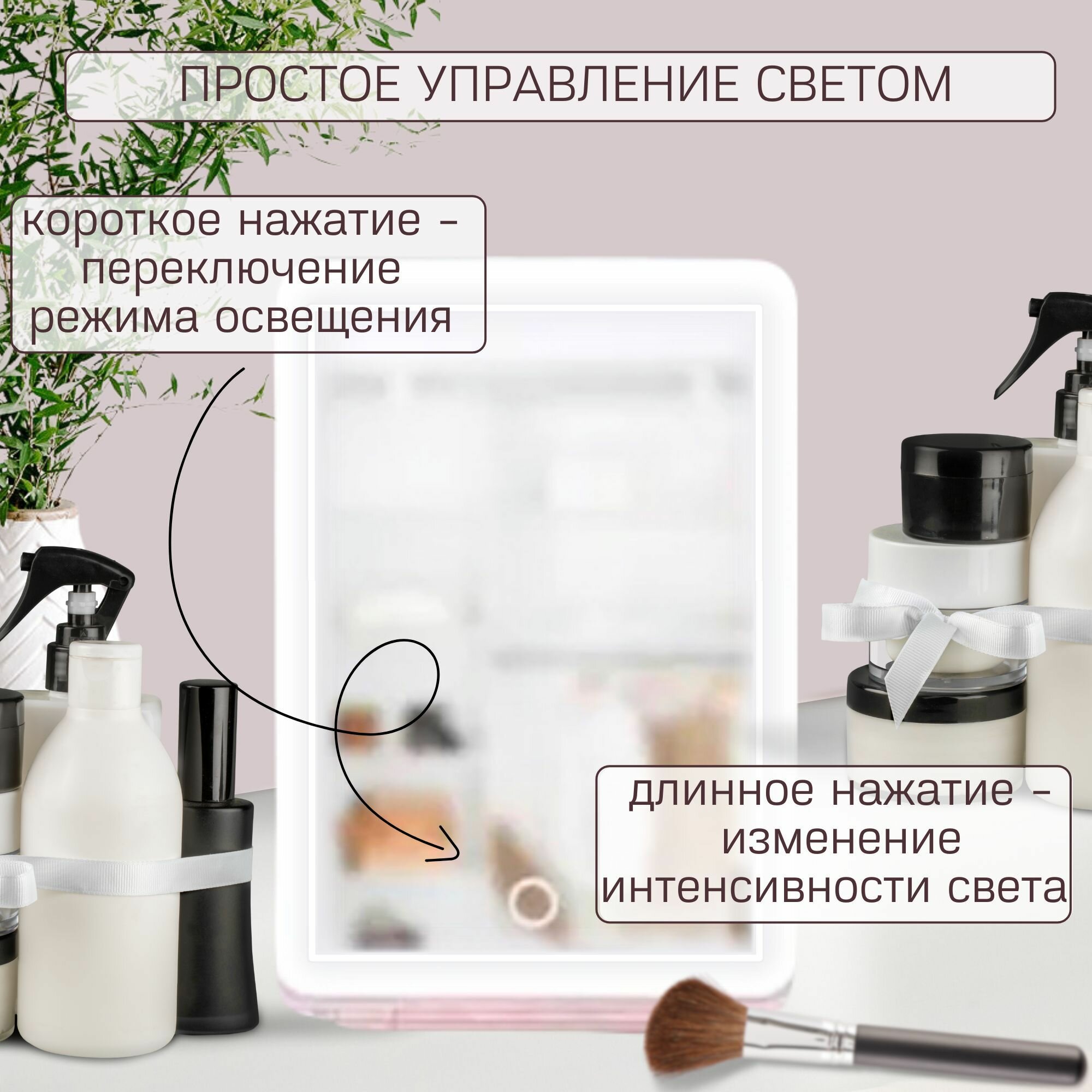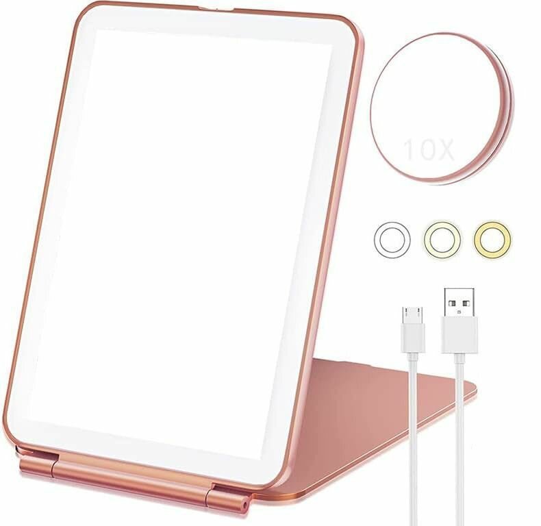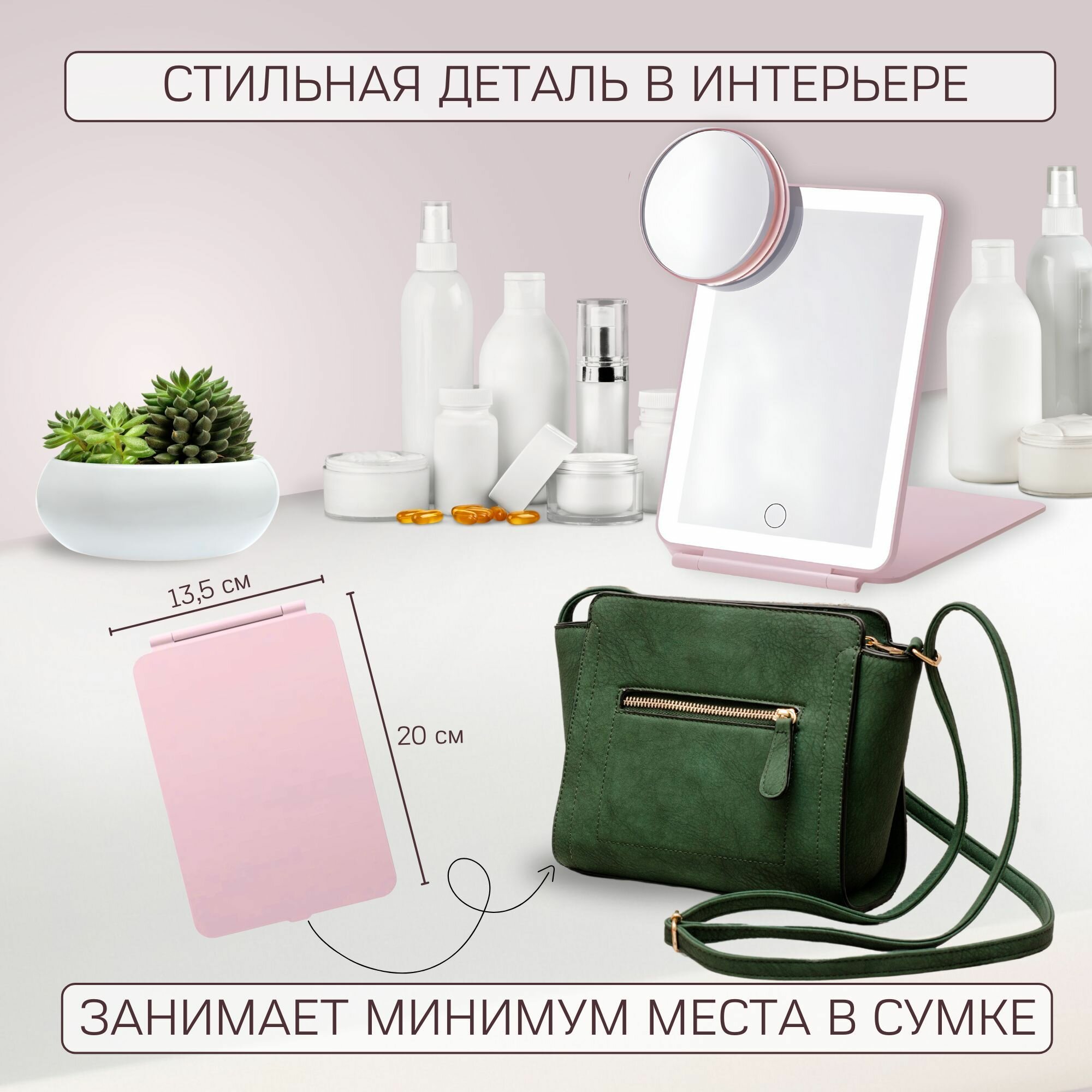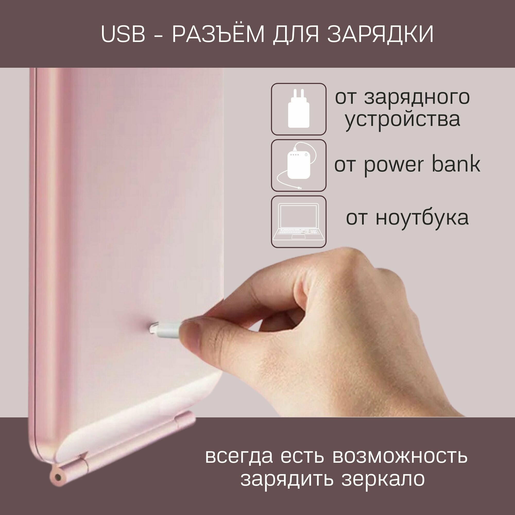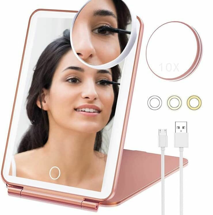 | Способ применения | - Зеркало для макияжа с подсветкой активируется с помощью специальной сенсорной кнопки. - Установите косметическое зеркало на стол с удобным вам наклоном. - Отрегулируйте яркость подсветки сенсорной кнопкой, выбрав натуральный, яркий или теплый свет. - Для зарядки зеркала используйте кабель из комплектации и ваш адаптер питания. |