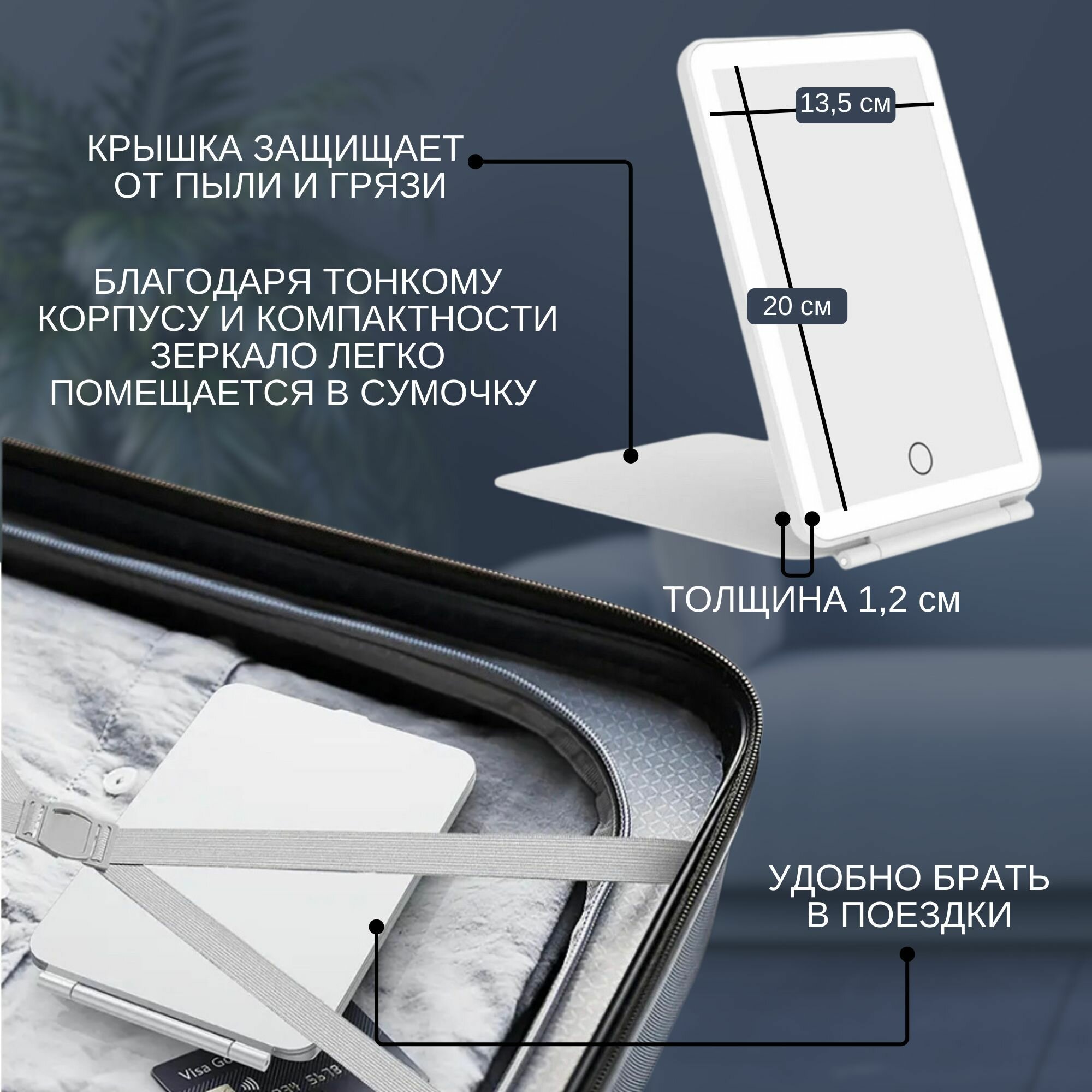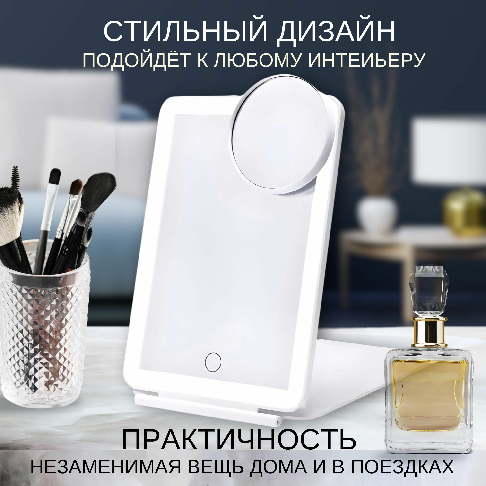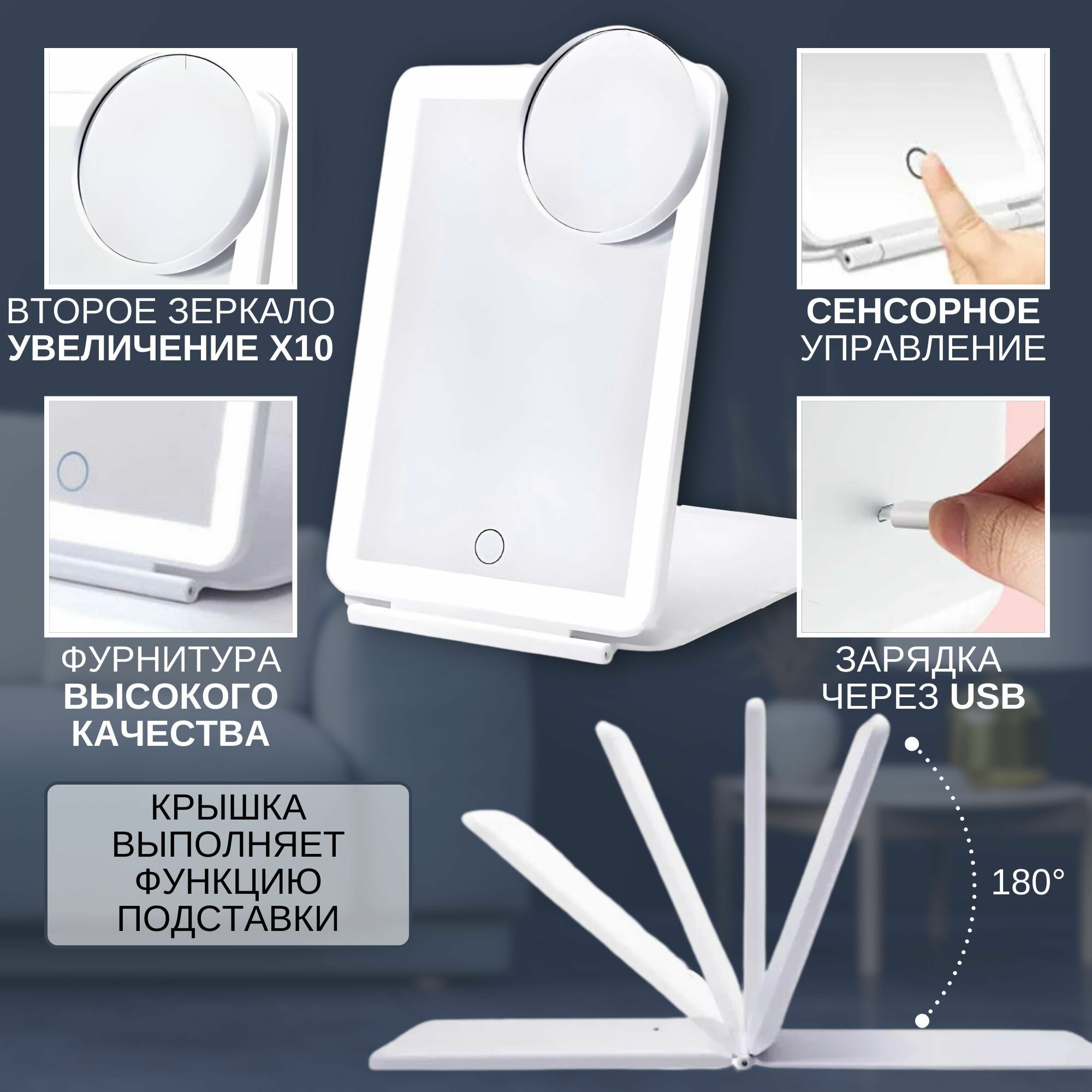 | Способ применения | - Зеркало для макияжа с подсветкой активируется с помощью специальной сенсорной кнопки. - Установите косметическое зеркало на стол с удобным вам наклоном. - Отрегулируйте яркость подсветки сенсорной кнопкой, выбрав натуральный, яркий или теплый свет. - Для зарядки зеркала используйте кабель из комплектации и ваш адаптер питания. |