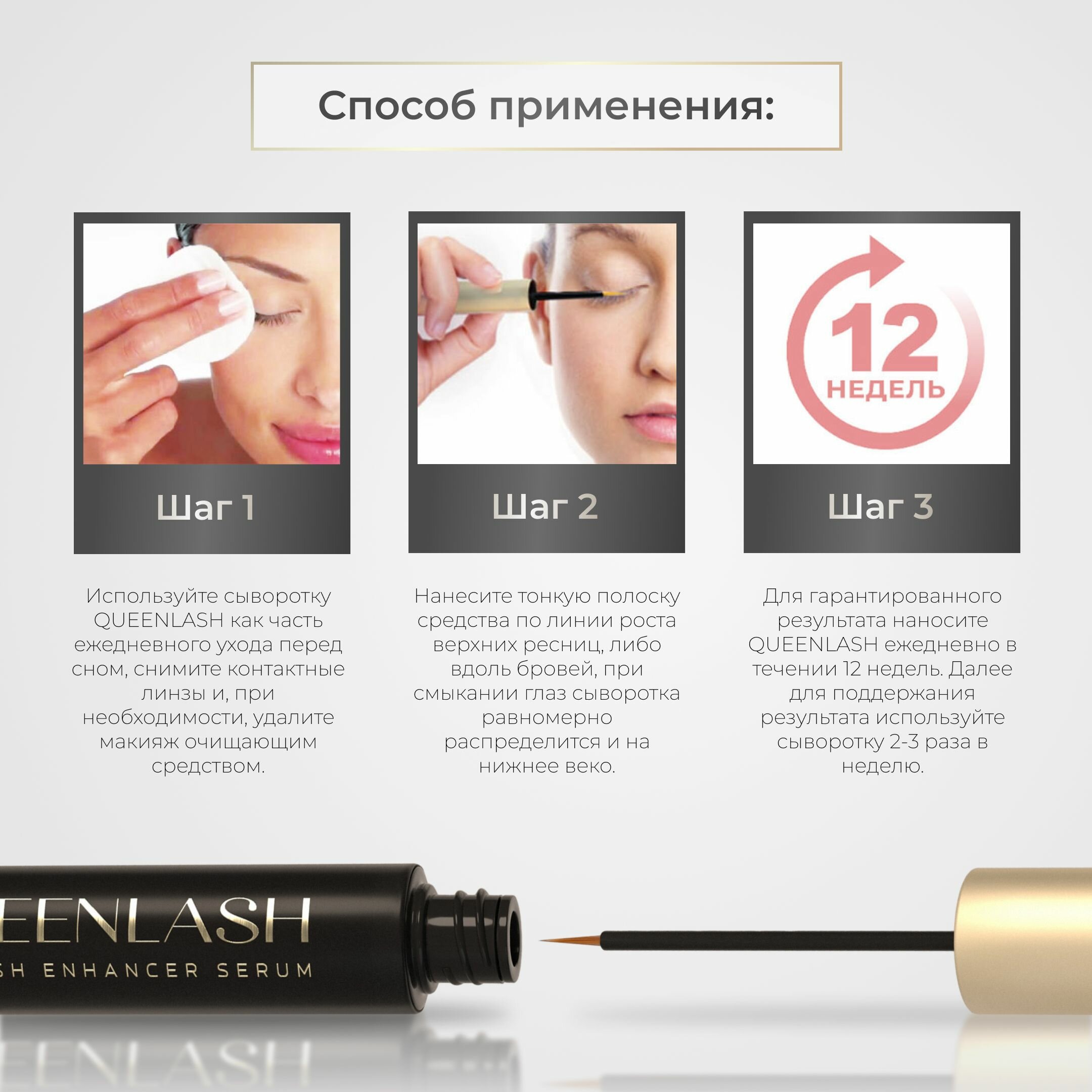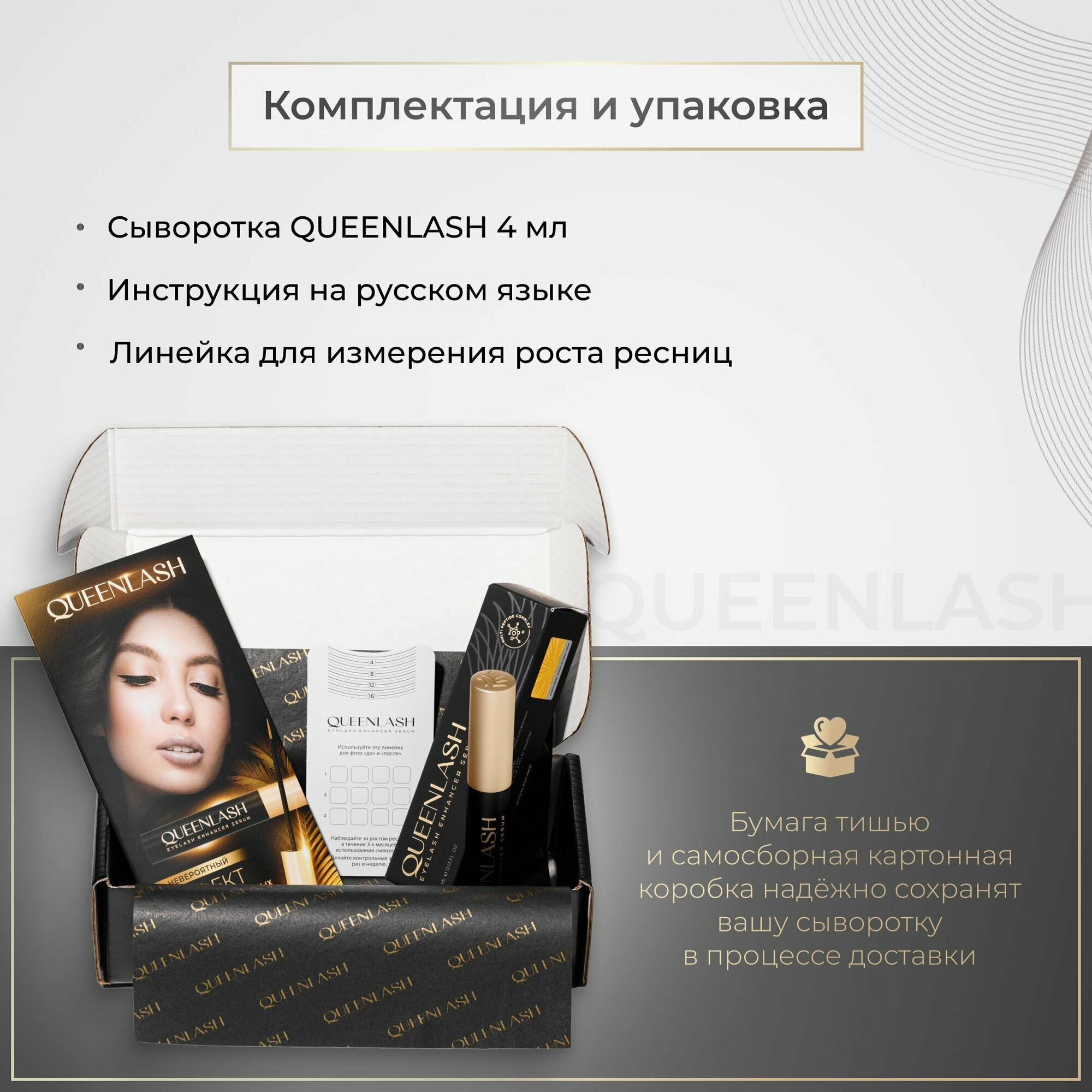 | Подробная комплектация | Queenlash средство для роста ресниц и бровей; Инструкция по применению средства для роста ресниц и бровей Квинлаш; Линейка для измерения роста ресниц |