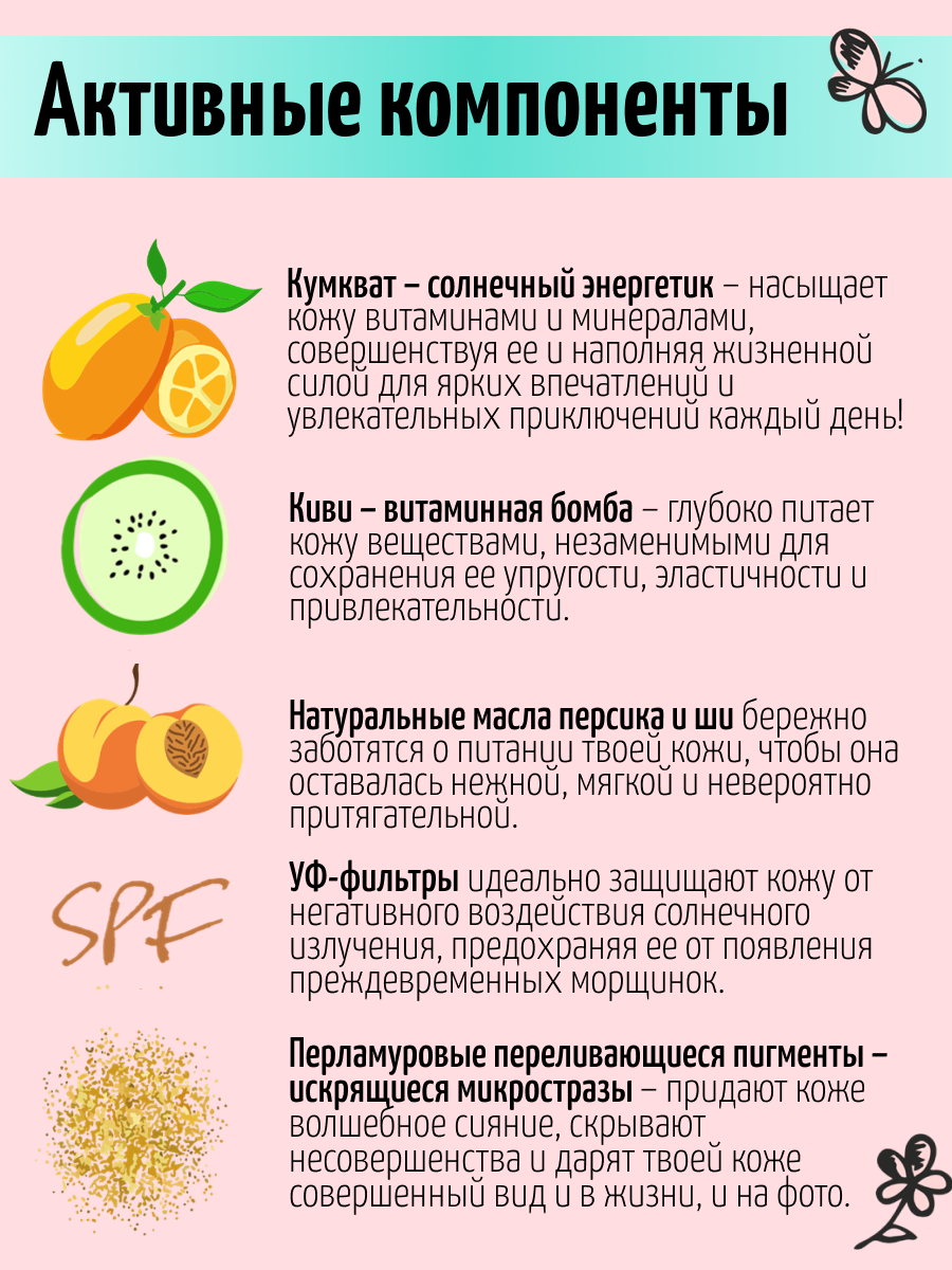 | Состав | вода, циклопентасилоксан, циклогексасилоксан, этилгексилизононаноат, цетиловый спирт, глицерилстеарат, ПЭГ-75 стеарат, цетет-20, стеарет-20, глицерин, CI 77891 (диоксид титана), дикаприлилкарбонат, этилгексилметоксициннамат, фенилтриметикон, CI 77492 (оксиды железа), CI 77491 (оксиды железа), CI 77499 (оксиды железа), слюда, сополимер гидроксиэтилакрилата/акрилоилдиметилтаурата натрия, феноксиэтанол, метилпарабен, этилпарабен, пропилпарабен, масло косточек Prunus Persica (персика), бетаин, синтетический фторфлогопит, диоксид титана, экстракт плодов Citrus Japonica (кумквата), парфюмерная композиция, изопропилмиристат, масло зародышей Triticum vulgare (пшеницы), токоферилацетат, БГТ, 2-бром-2-нитропропан-1,3-диол, цитронеллол, линалол |
