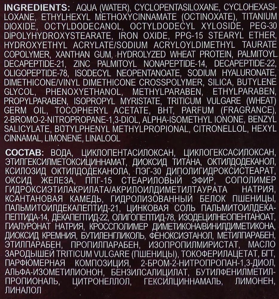 | Состав | вода, этилгексилметоксициннамат, циклопентасилоксан, циклогексасилоксан, диоксид титана, октилдодеканол, ксилозид октилдодеканола, ПЭГ-30 диполигидроксистеарат, оксид железа, ППГ-15 стеариловый эфир, сополимер гидроксиэтилакрилата/акрилоилдиметилтаурата натрия, изодецилнеопентаноат, ксантановая камедь, гидролизованный белок пшеницы, пальмитоилдекапептид-21, цинковая соль пальмитоилдекапептида-14, декапептид-22, олигопептид-78, гиалуронат натрия, кроссполимер диметикона/винилдиметикона, диоксид кремния, бутиленгликоль, феноксиэтанол, метилпарабен, этилпарабен, пропилпарабен, изопропилмиристат, масло зародышей Triticum vulgare (пшеницы), токоферилацетат, БГТ, парфюмерная композиция, 2-бром-2-нитропропан-1,3-диол, альфа-изометилионон, бензилсалицилат, бутилфенилметилпропиональ, цитронеллол, гексилциннамаль, лимонен, линалол |