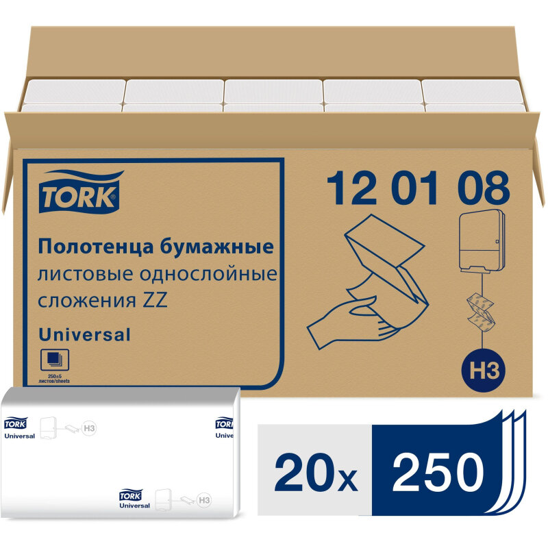 Полотенца бумажные листовые однослойные Tork Universal H3 ZZ, 23х23 см, 20 пачек по 250 л., артикул 120108